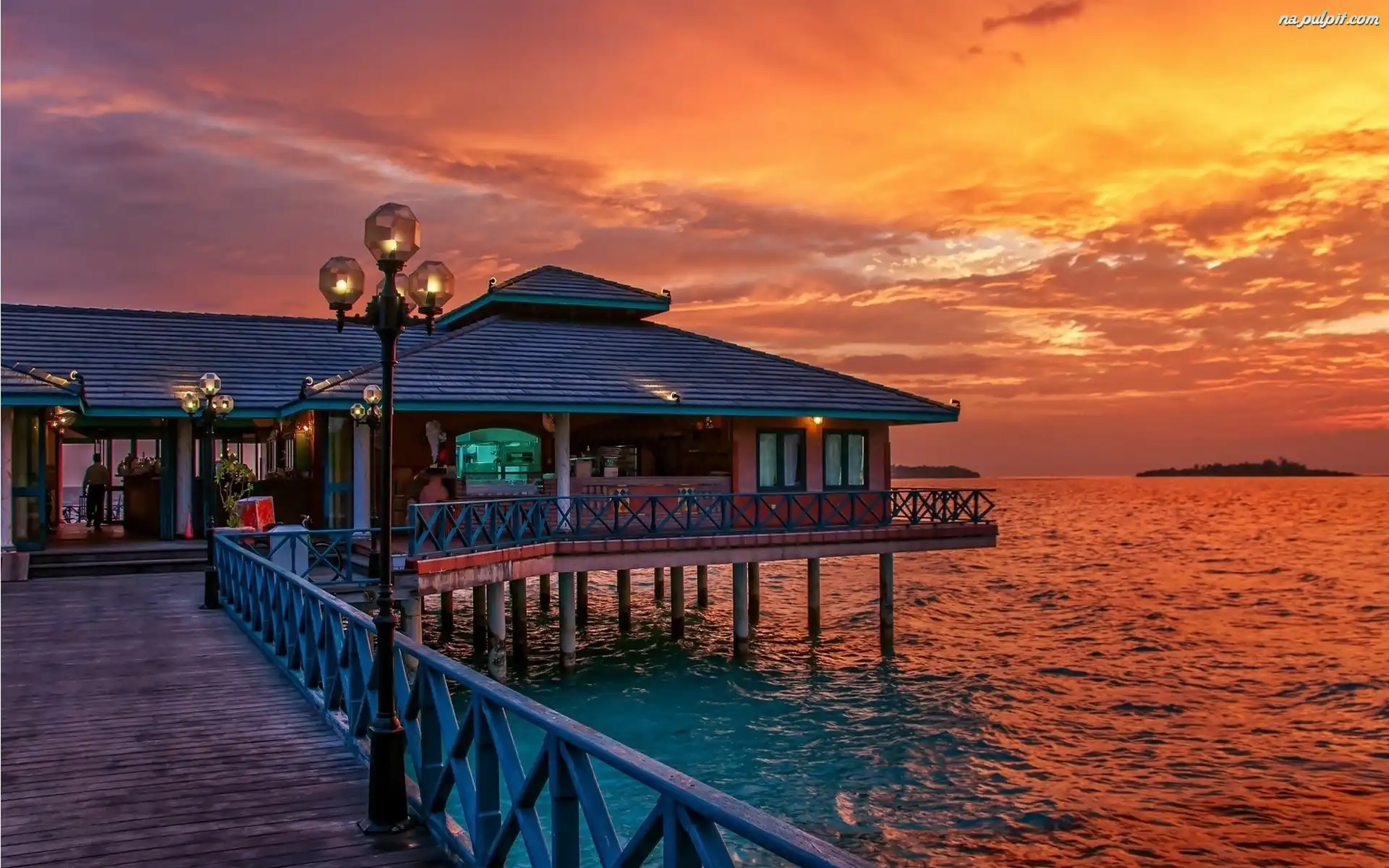 Malediwy, Zachód, Słońca, Wyspa, Restauracja, Ocean Na Pulpit