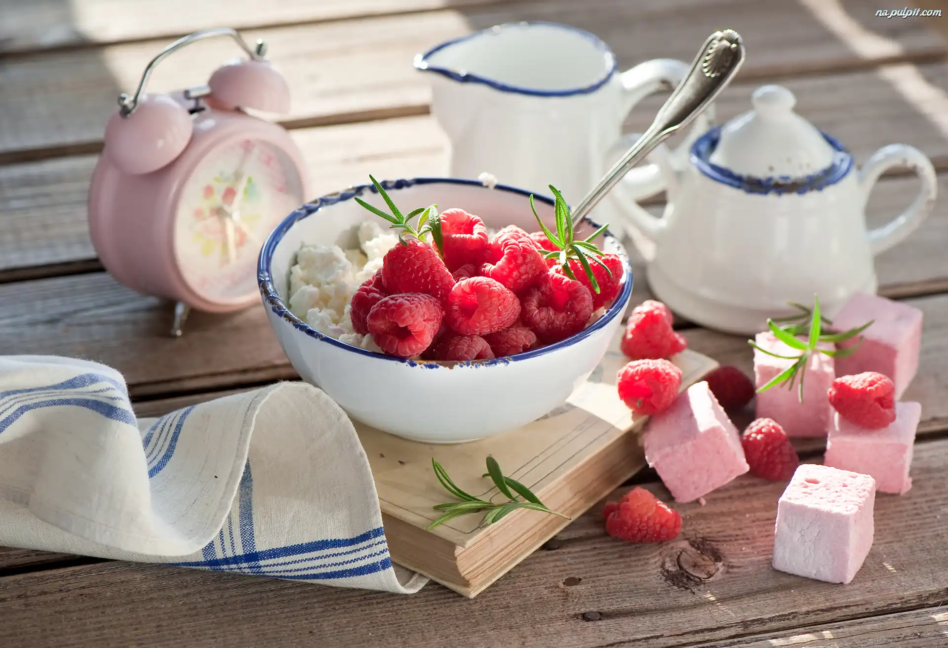 Maliny, Budzik, Książka, Twaróg, Kompozycja, Miseczka