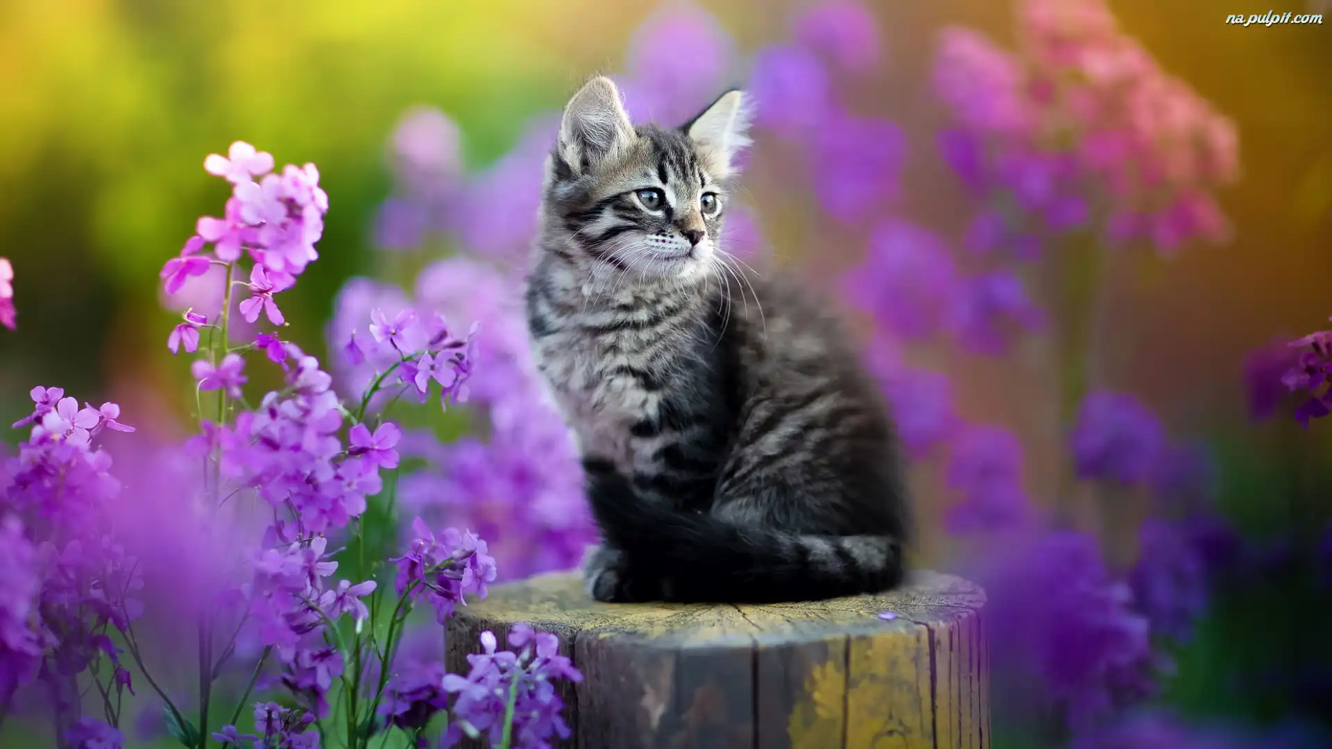 Mały, Kwiaty, Pieniek, Kot, Bury, Fioletowe Na Pulpit