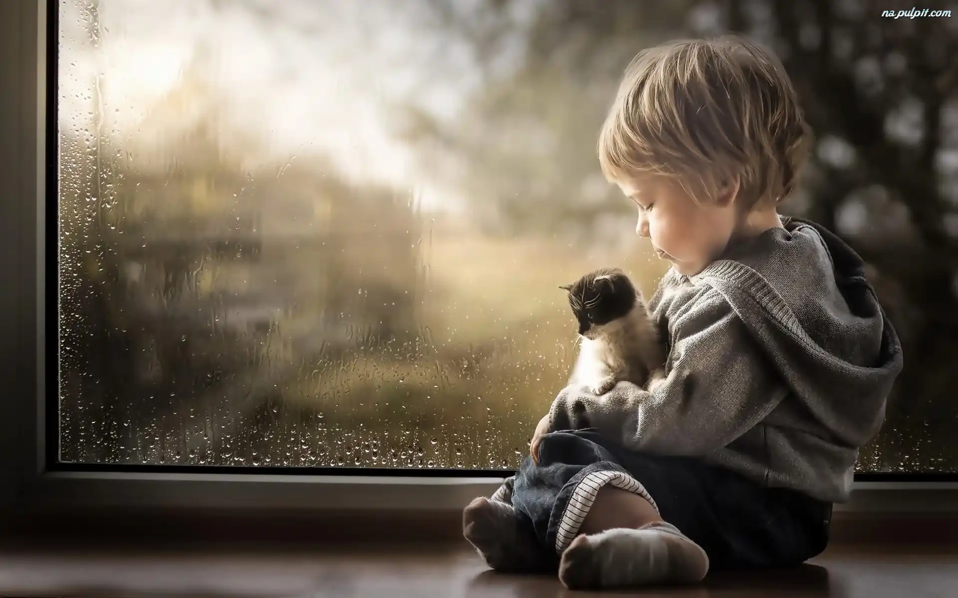 Mały, Okno, Deszcz, Kotek, Chłopczyk, Przyjaźń Na Pulpit