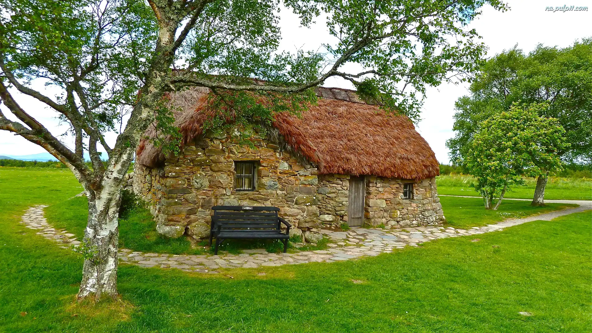 Drzewa, Mały, Domek, Trawa, Ławka Na Pulpit