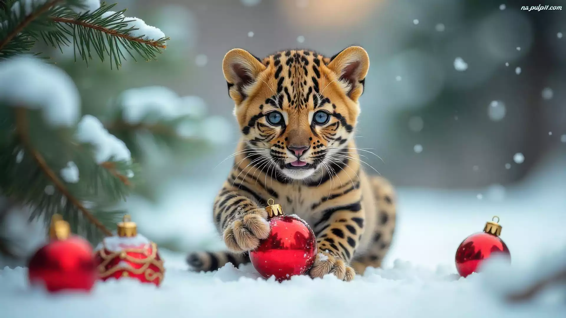 AI, Czerwone, Gałązki, Mały, Lampart, Śnieg, Bombki Na Pulpit