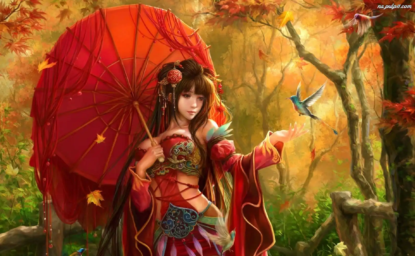 Manga Anime, Las, Parasol, Dziewczyna, Ptak Na Pulpit