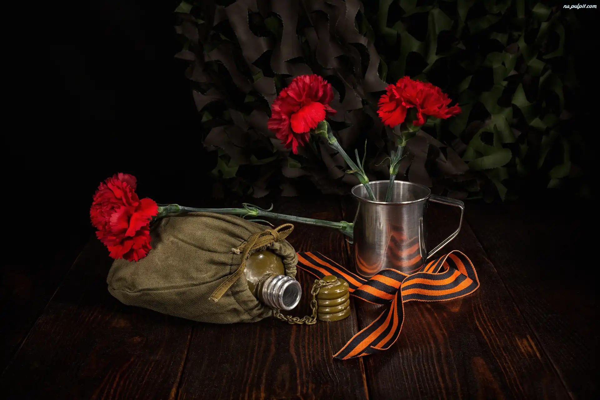 Manierka, Kubek, Goździki, Kwiaty, Wstążka Na Pulpit