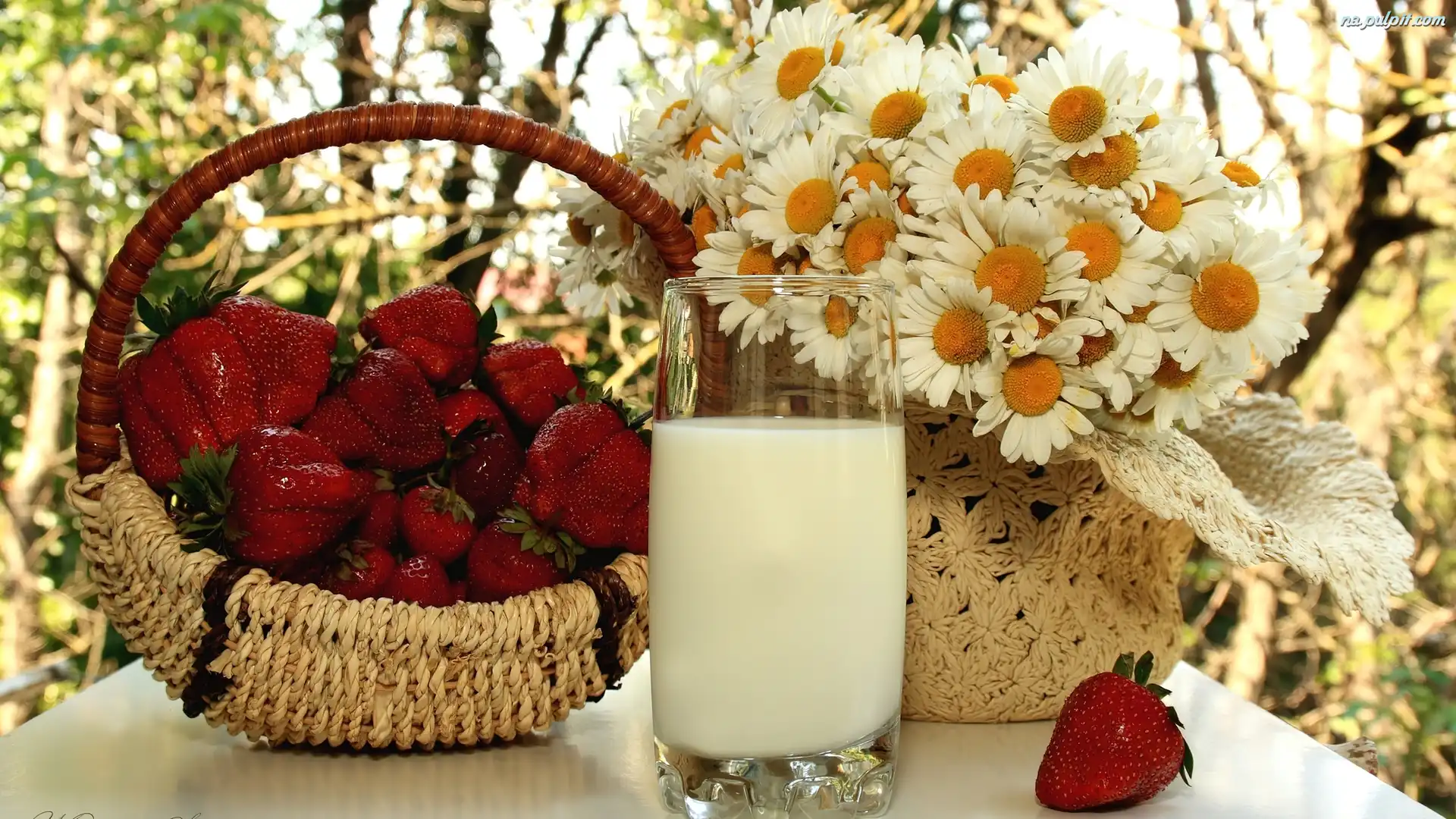 Margarytki, Truskawki, Koszyki, Mleko Na Pulpit