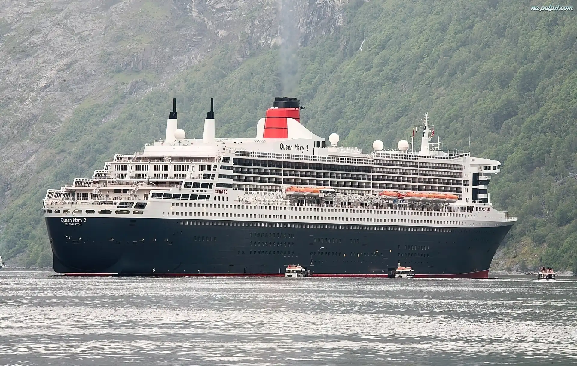 Queen Mary 2, Dziób Miasto, Queen Mary 2, Statek, Jachty Queen Mary 2, Wycieczkowiec Queen Mary 2, Statek, Pasażerski Miasta, Mary 2, Queen, Panorama Morze, Queen Mary 2, Wzburzone Queen Mary 2 Queen Mary 2 Wodospad, Statek Queen Mary 2, Fiord Sognefjord, Norwegia, Góry Góry, Queen Mary 2, Zbocze Queen Mary 2, Statek, Pasażerski Mary 2, Wycieczkowy, Statek, Queen