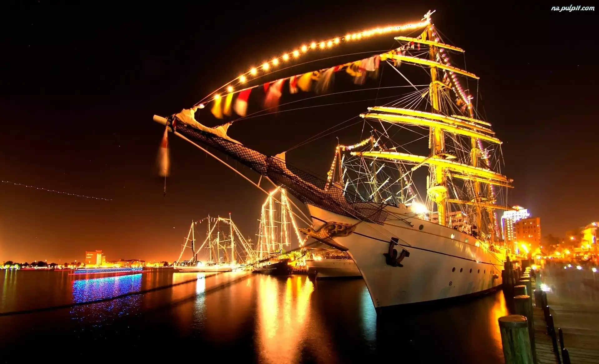 Maszty, Żaglowiec, Oświetlony, Woda Na Pulpit