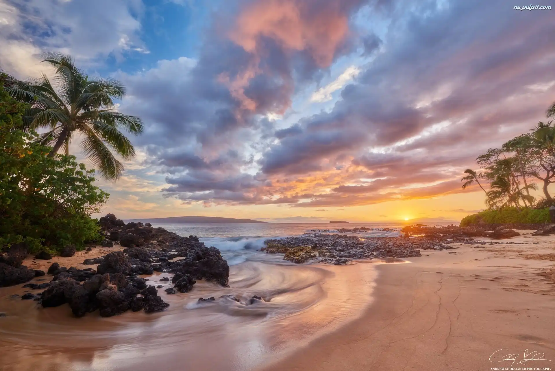 Wyspa Maui, Palmy, Chmury, Morze, Hawaje, Zachód słońca Na Pulpit