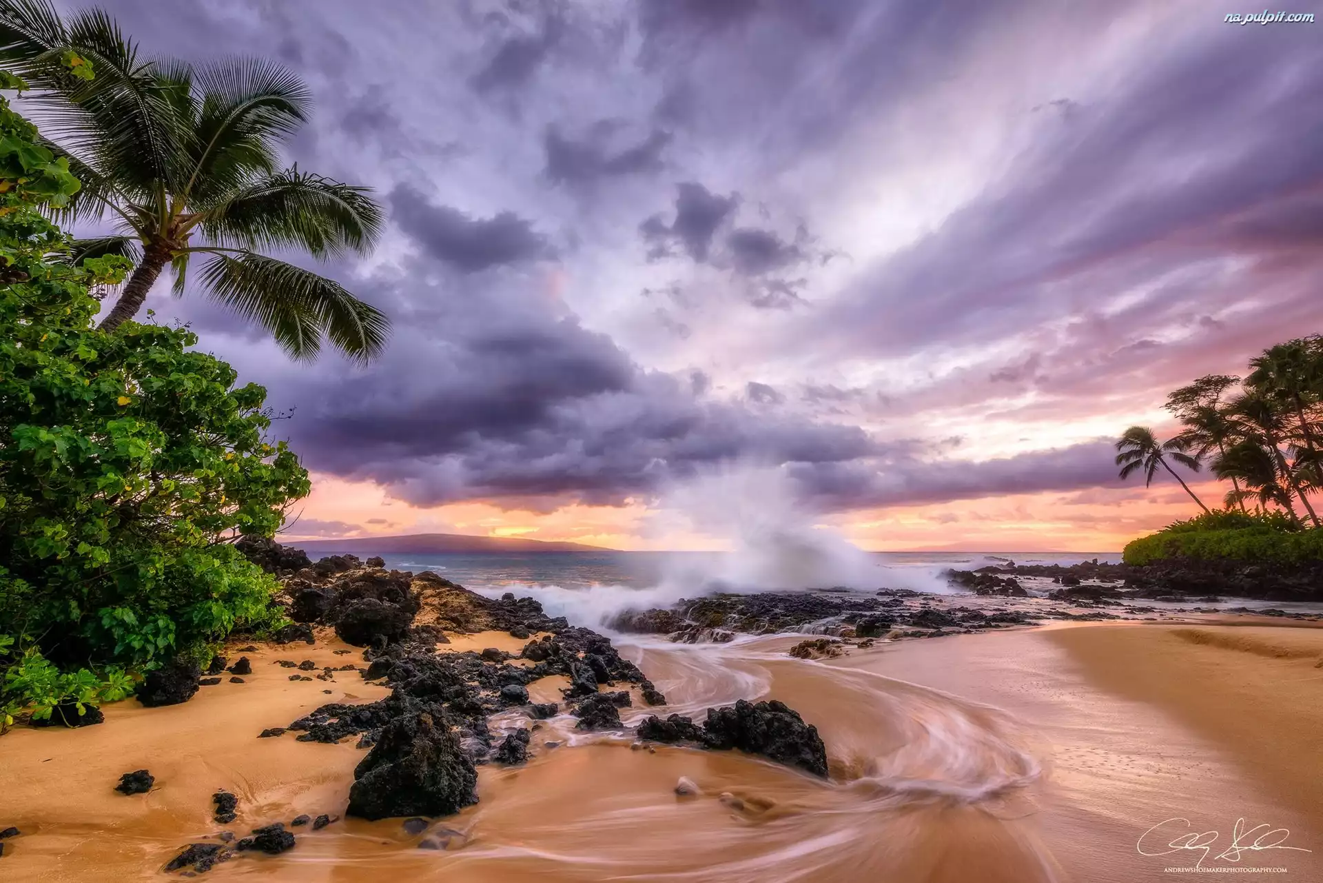 Wyspa Maui, Palmy, Chmury, Morze, Hawaje, Fale