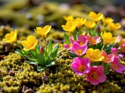 Różowe, Żółte, Kwiaty, Mech