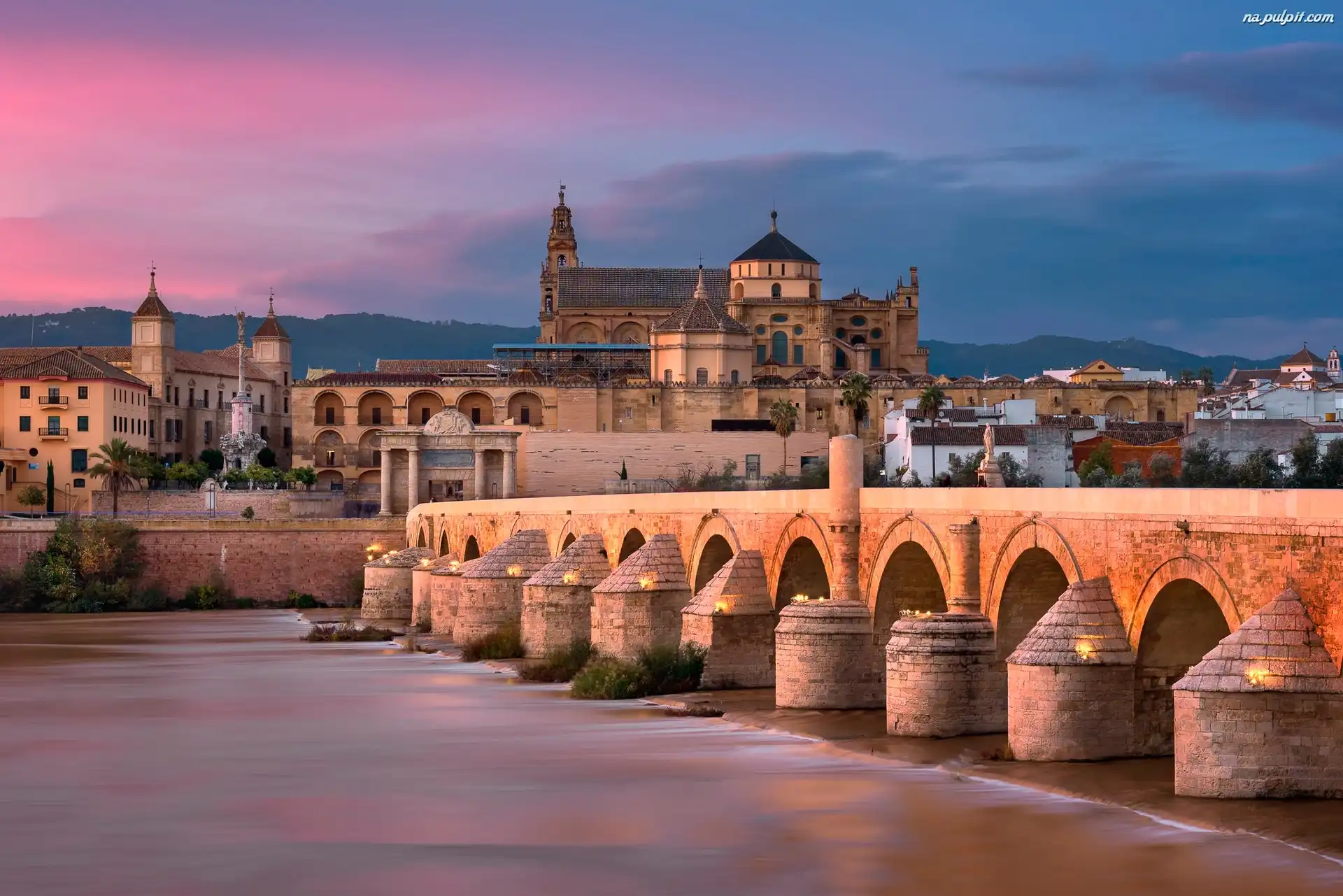 Meczet Mezquita, Andaluzja, Kordoba, Rzeka Gwadalkiwir, Mezquita-Catedral, Katedra, Most Puente Romano, Hiszpania, Most Rzymski Na Pulpit |