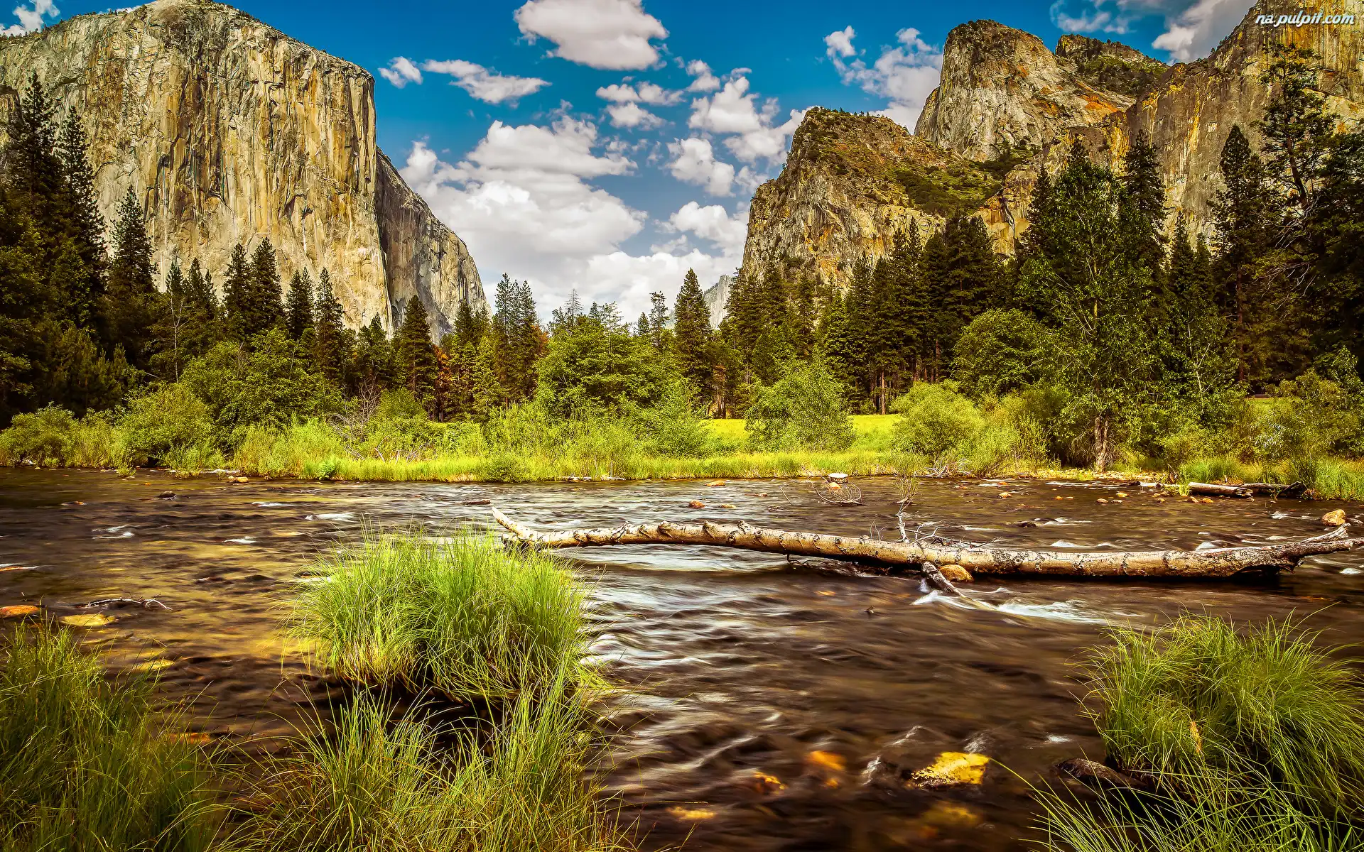 Merced River, Góry, Kamienie, Sierra Nevada, Rzeka, Szuwary, Trawa, Stany Zjednoczone, Kalifornia, Chmury, Krzaki, Park Narodowy Yosemite, Drzewa Na Pulpit |