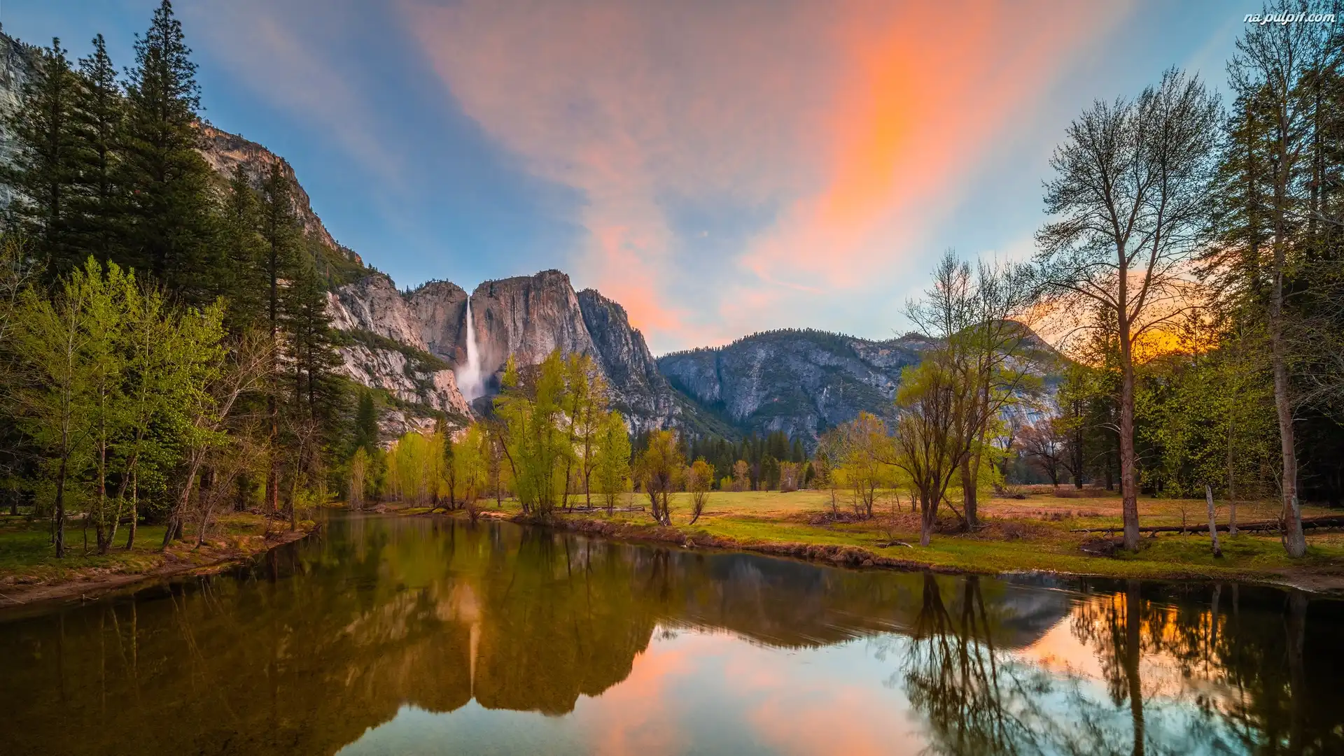 Rzeka, Park Narodowy Yosemite, Góry, Merced River, Odbicie, Sierra Nevada, Drzewa, Wodospad Na Pulpit |
