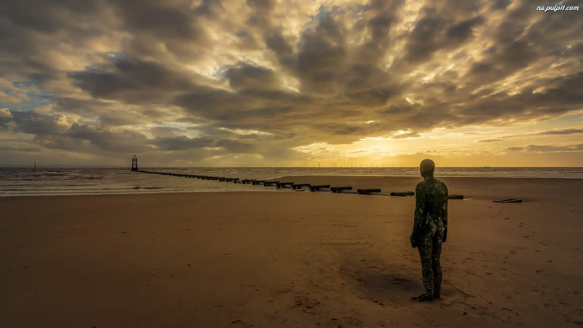 Anglia, Rzeka Mersey, Liverpool, Żeliwny, Plaża Crosby Beach, Zachód słońca, Posąg Na Pulpit