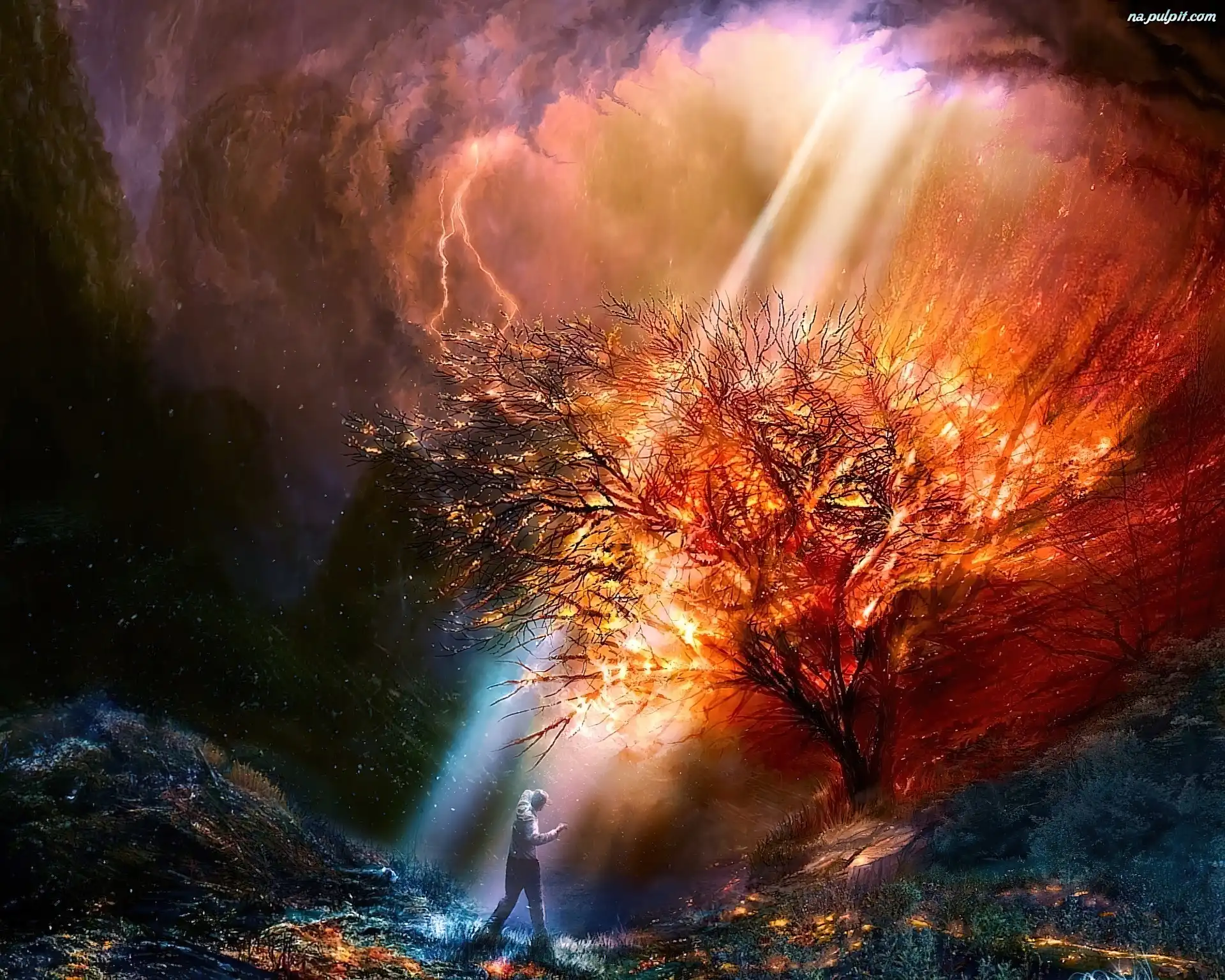 Mężczyzna, Płonące, Burza, Drzewo Na Pulpit