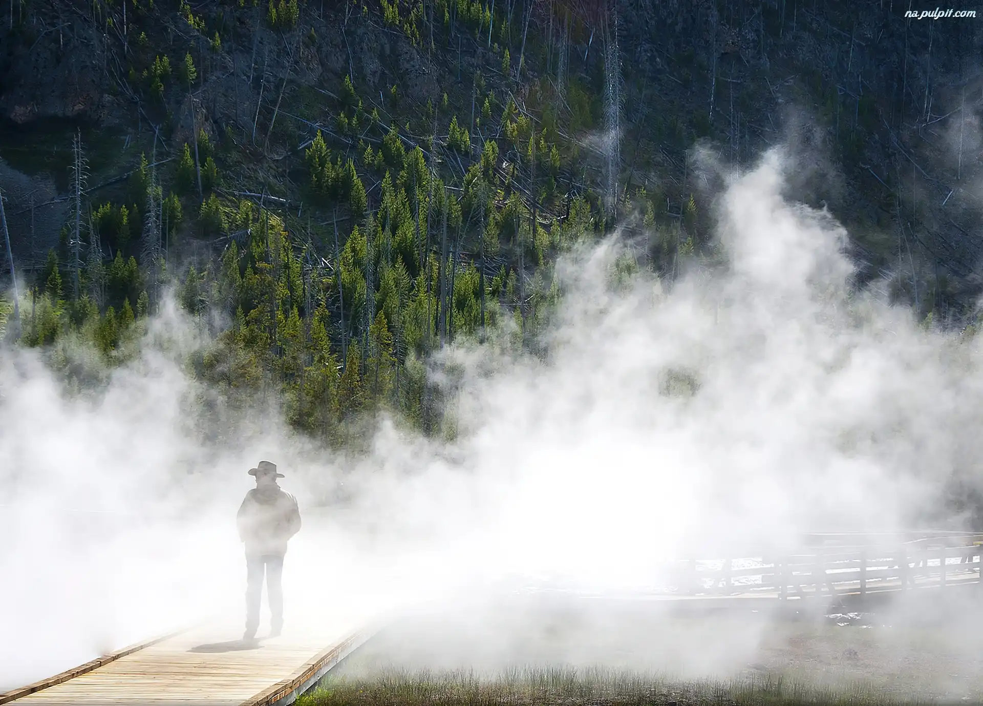 Mężczyzna, Mgła, Las, Mostek Na Pulpit
