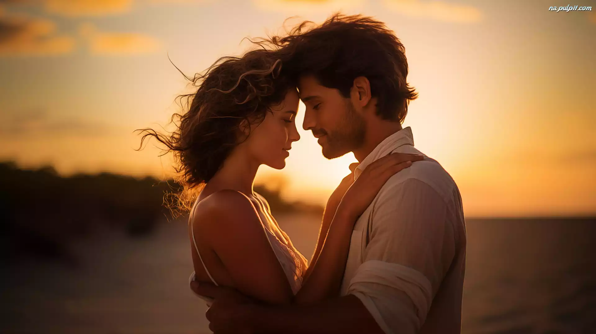 Kobieta, Mężczyzna, Przytuleni, Zachód słońca