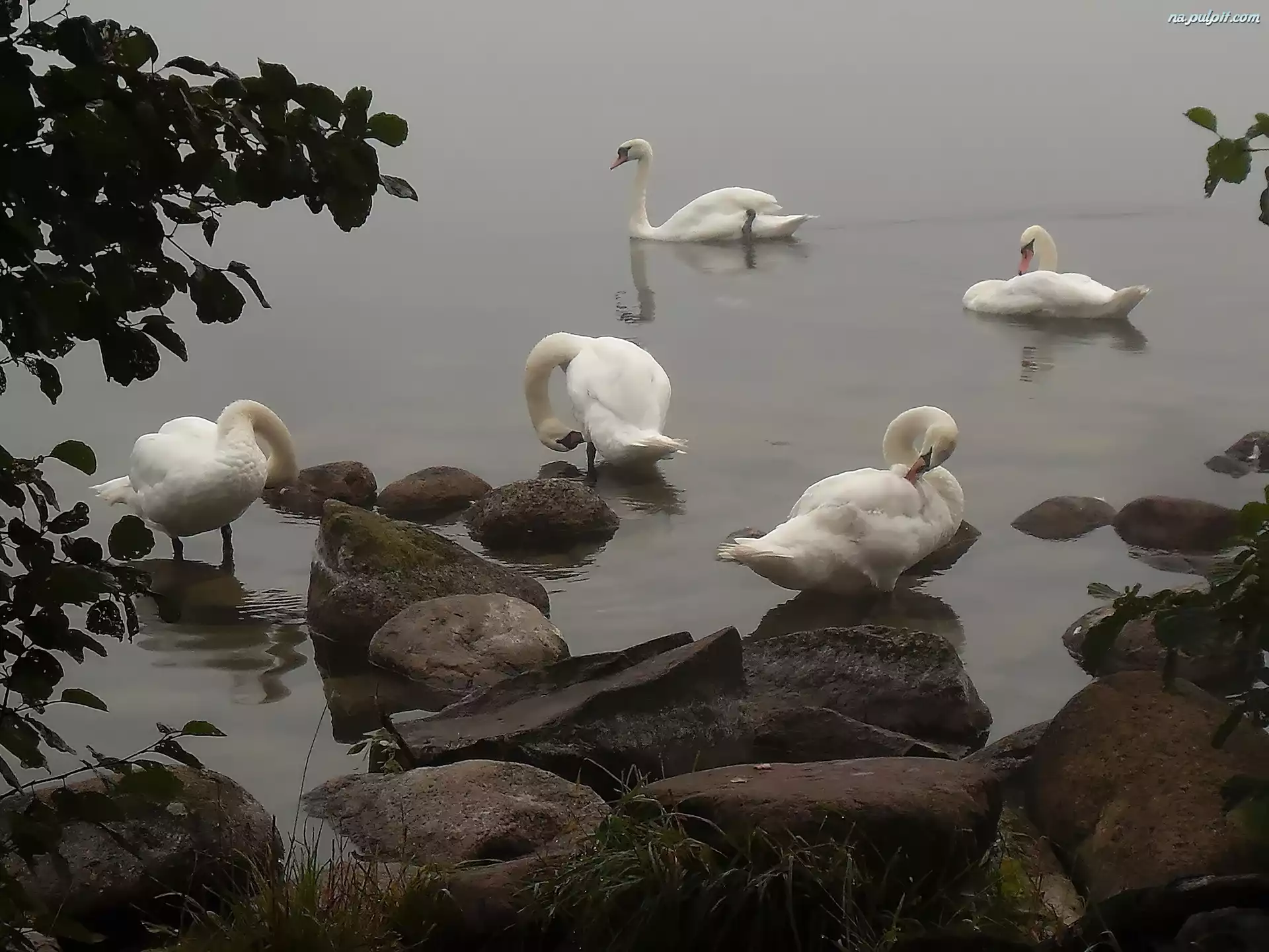 Mgła, Kamienie, Jezioro, Łabędzie, Liście Na Pulpit
