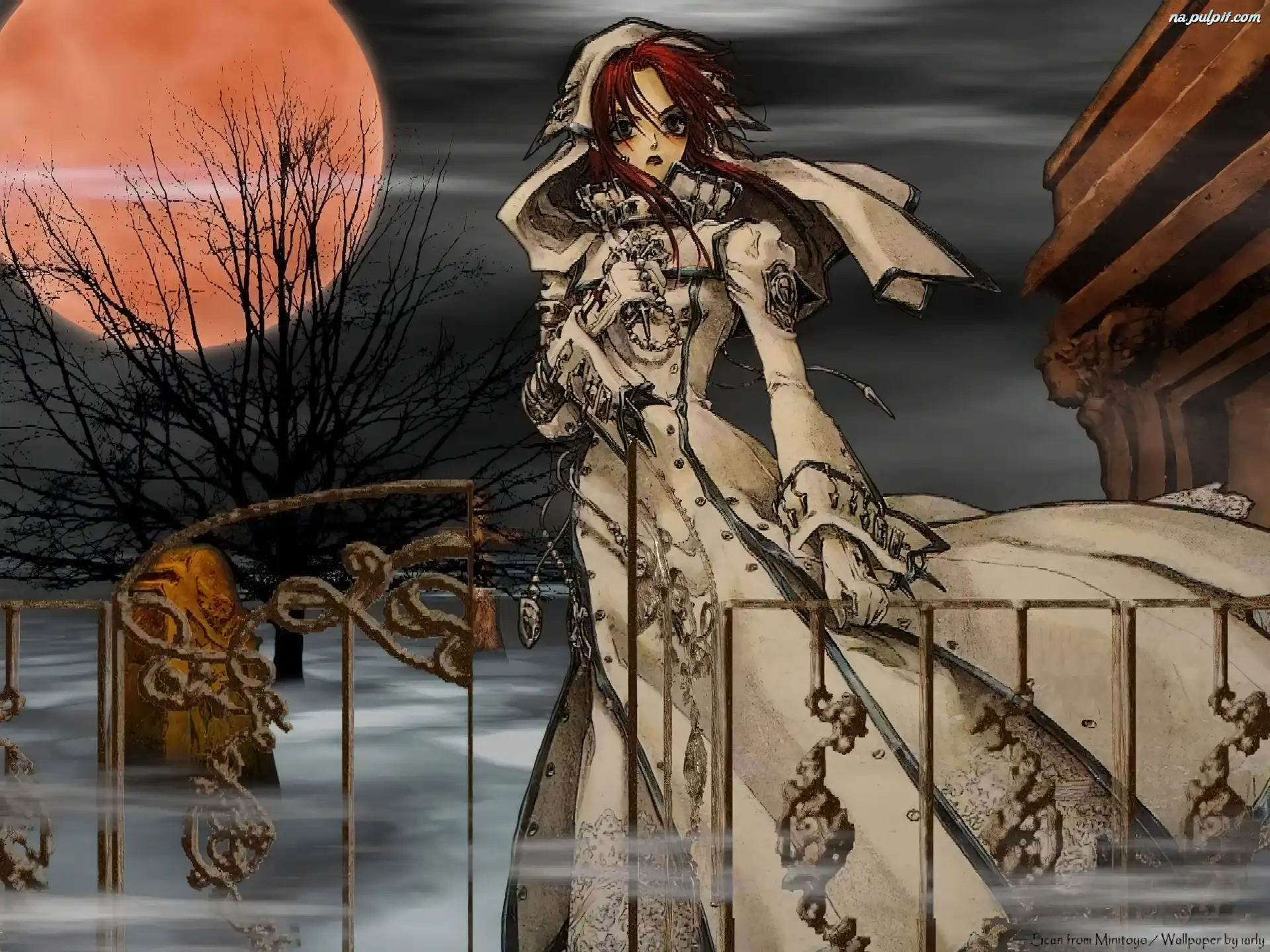 mgła, księżyc, kobieta, Trinity Blood, cmentarz Na Pulpit