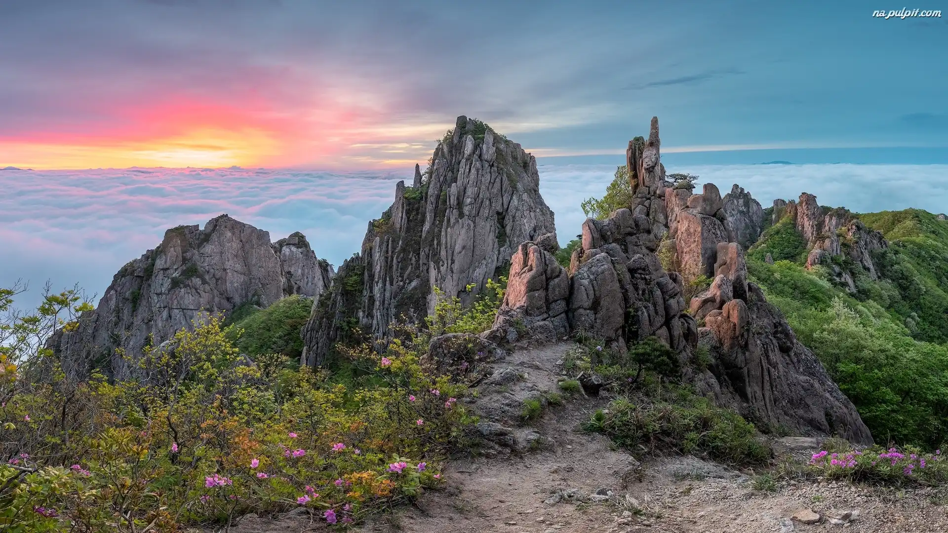 Góry, Mgła, Korea Południowa, Skały, Wschód słońca, Chmury Na Pulpit