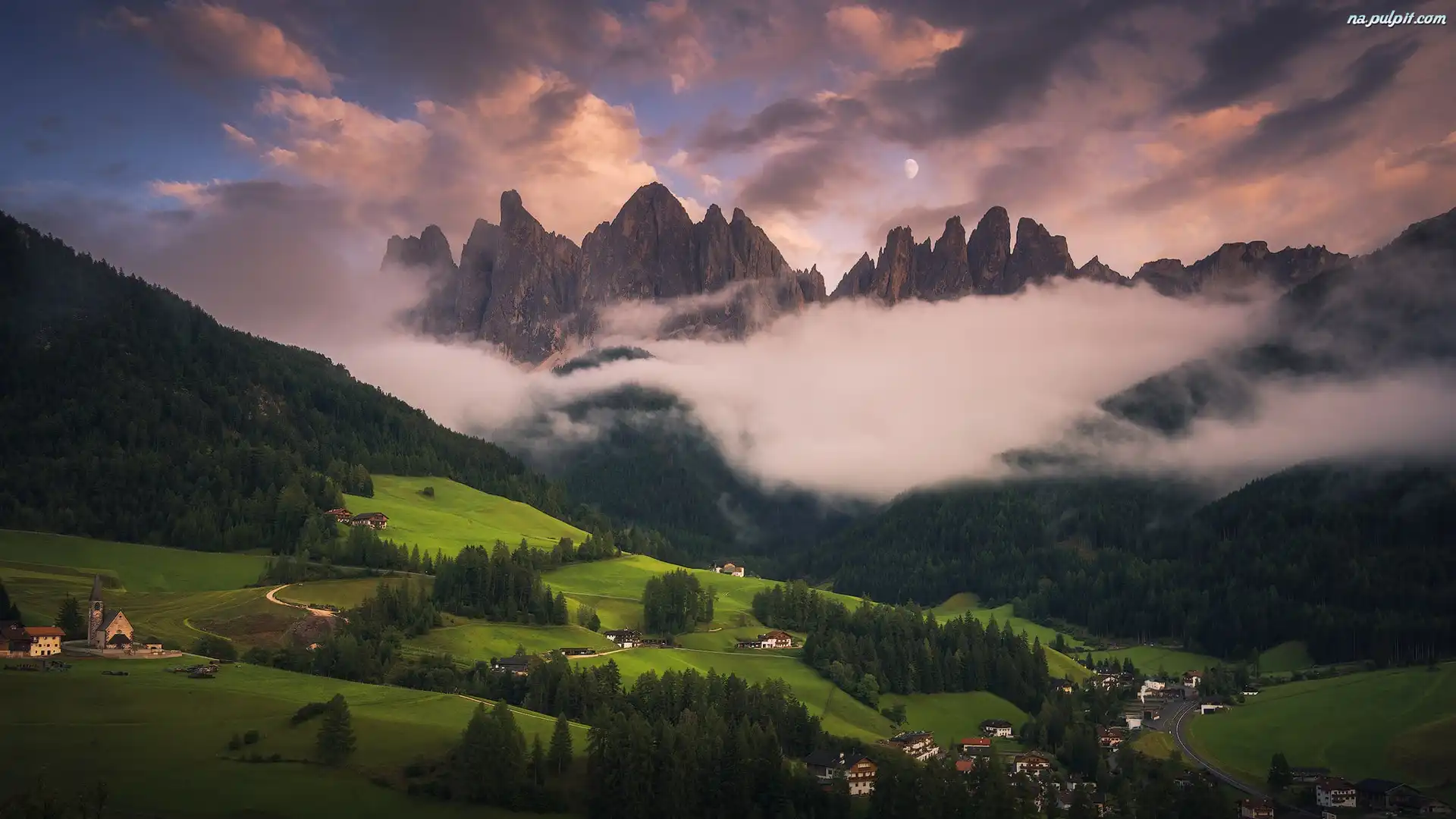Chmury, Dolomity, Domy, Las, Księżyc, Włochy, Drzewa, Góry, Mgła Na Pulpit