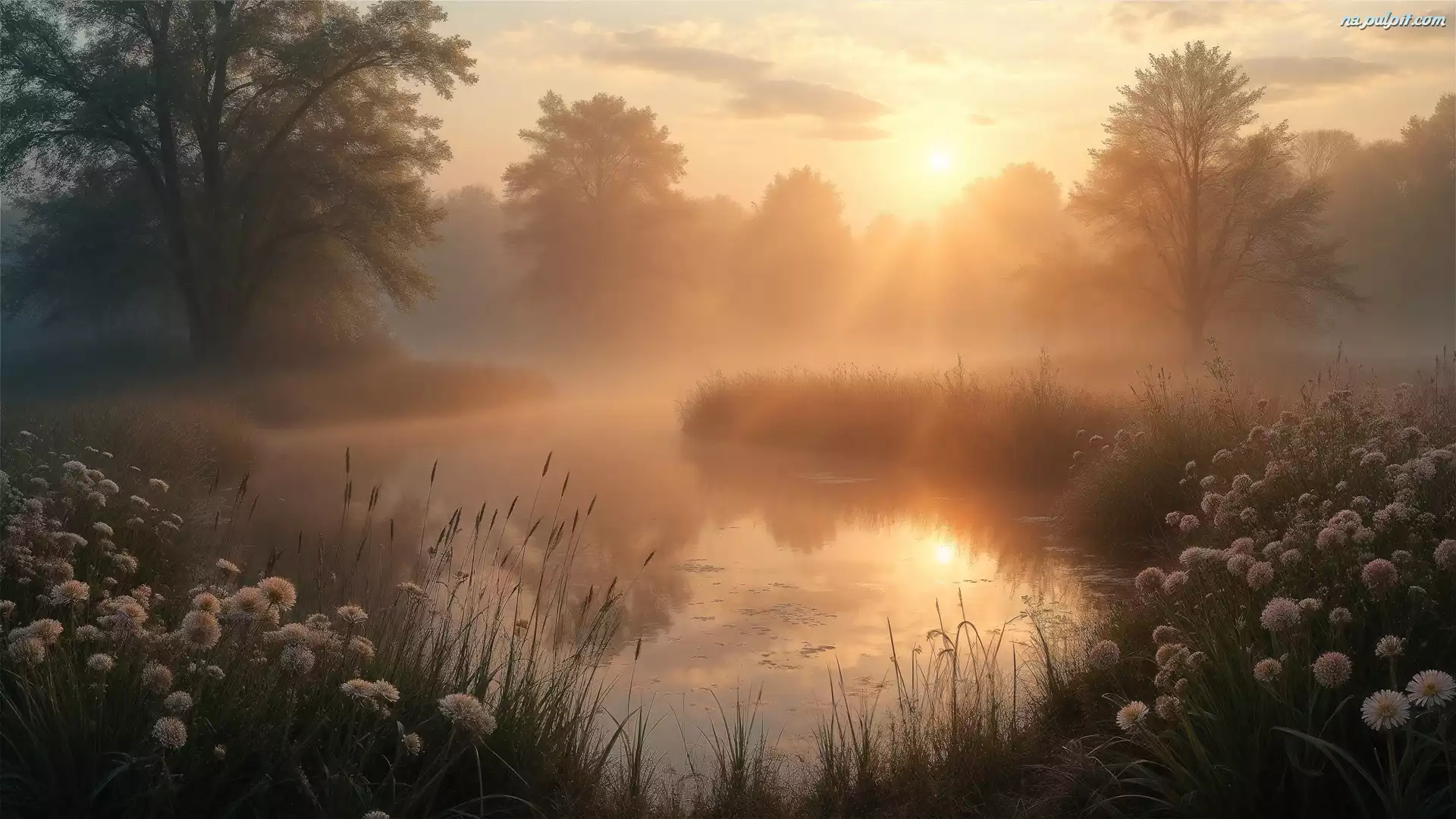 Świt, Jezioro, Drzewa, Mgła, Rośliny, Grafika AI Na Pulpit