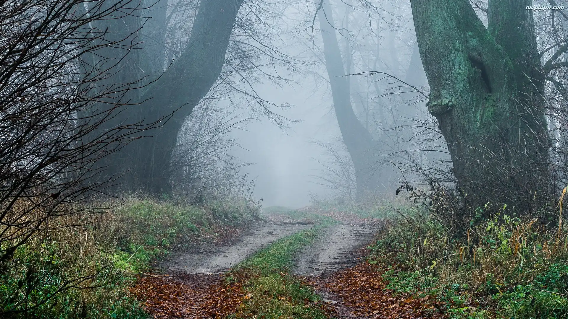Rośliny, Opadłe, Drzewa, Mgła, Droga, Stare, Liście Na Pulpit