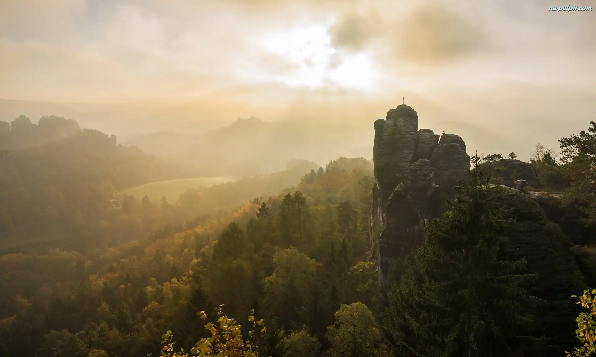 Mgła, Góry Połabskie, Drzewa, Formacja skalna Bastei, Park Narodowy Saskiej Szwajcarii, Niemcy, Skały Na Pulpit |