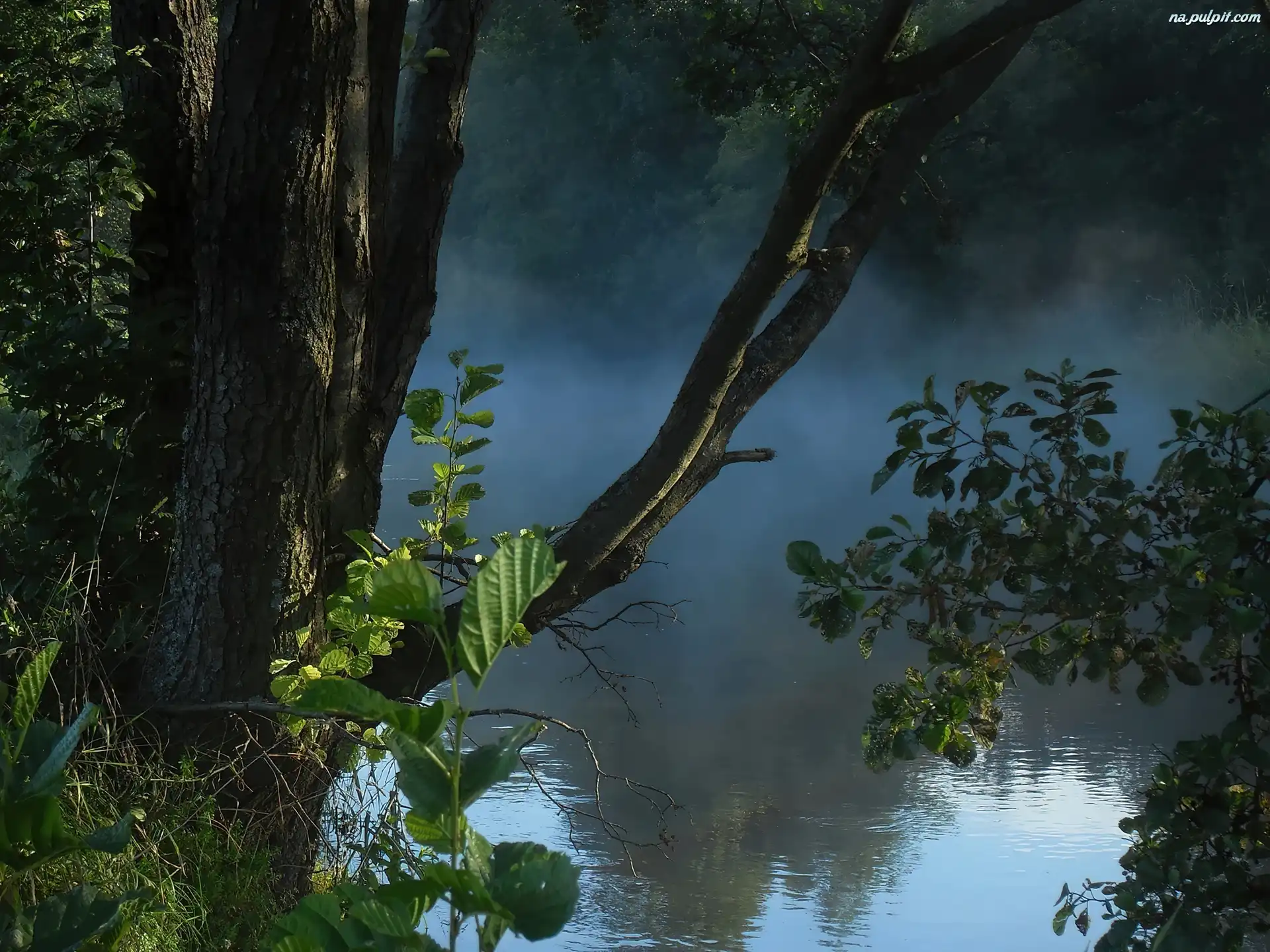 Mgła, Liście, Drzewo, Rzeka Na Pulpit