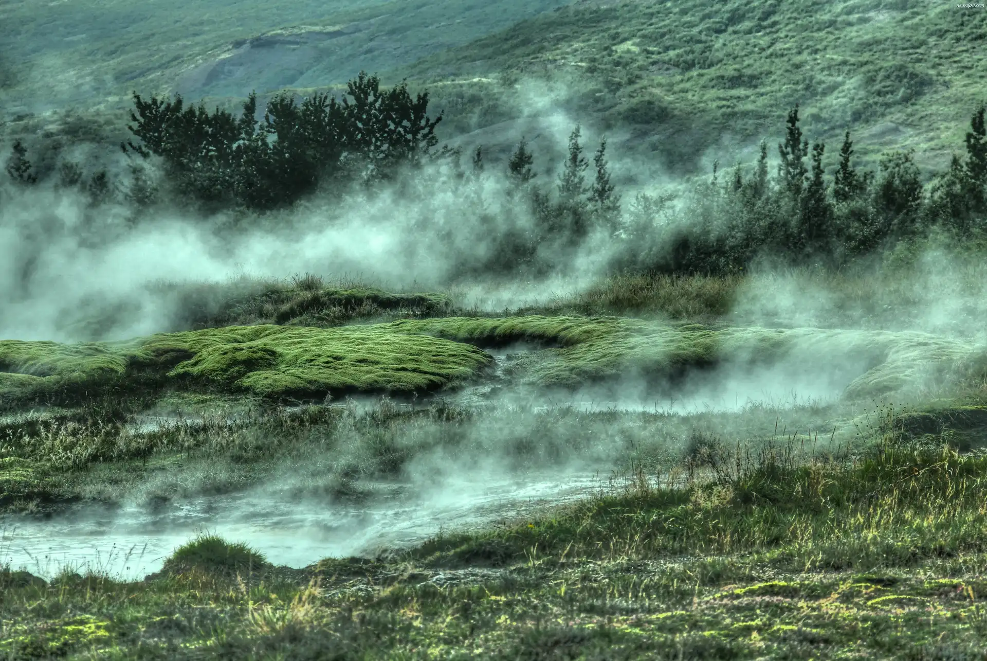 Mgła, Rzeka, Łąki, Góry, Las Na Pulpit