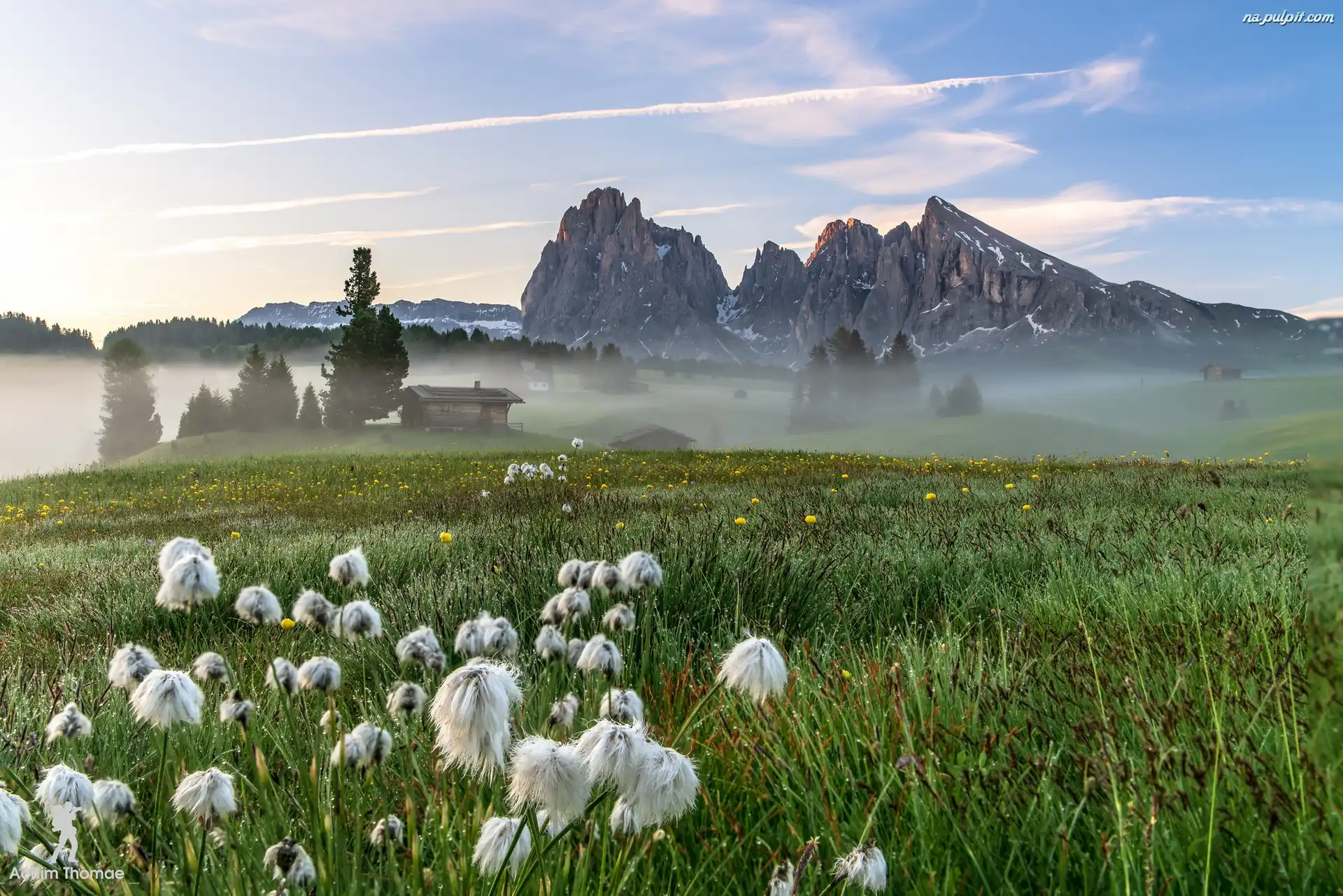 Góry Sassolungo, Kwiaty, Domy, Mgła, Dolomity, Włochy, Płaskowyż Seiser Alm, Łąka, Dolina Val Gardena Na Pulpit |