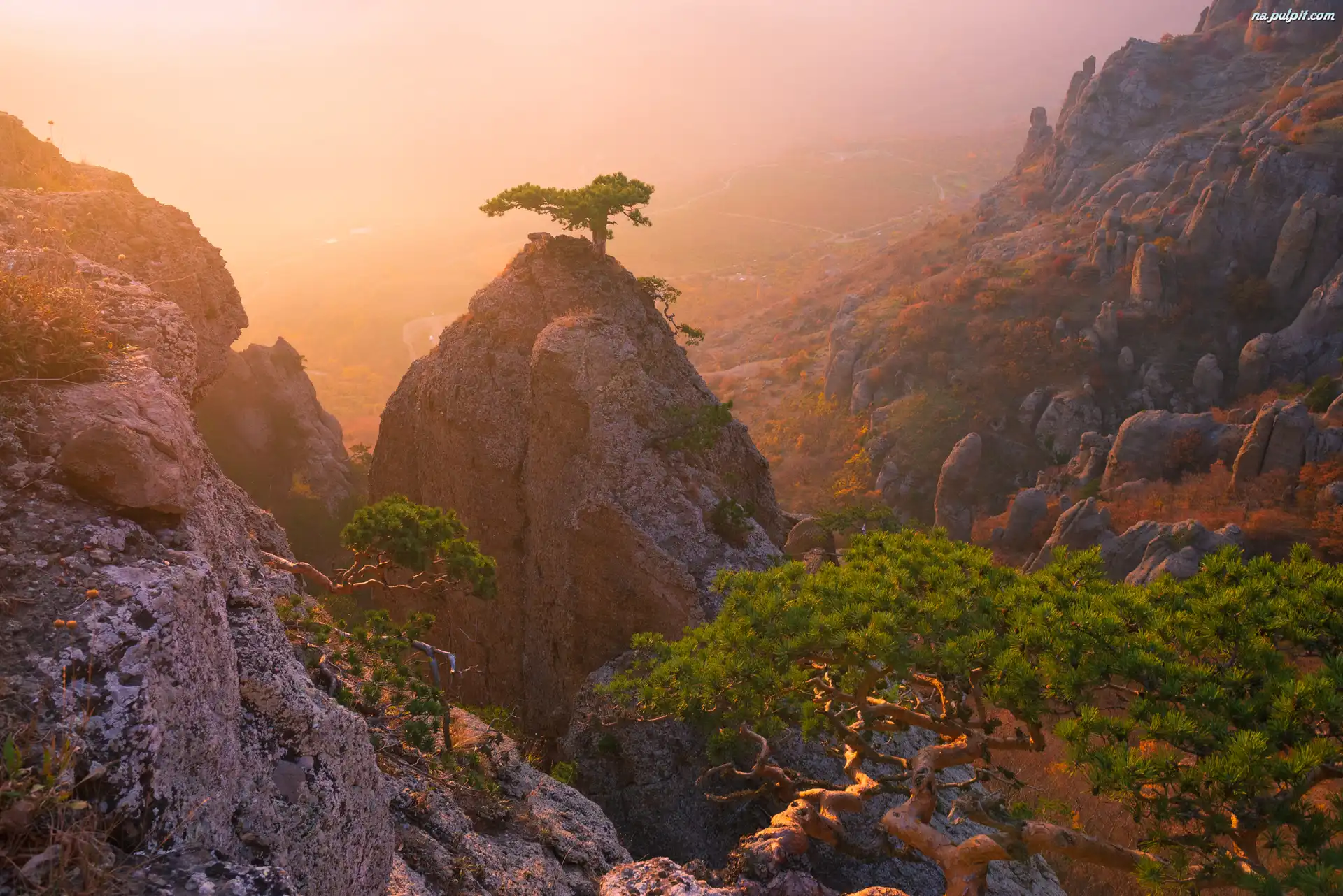 Mgła, Drzewa, Góry, Skały Na Pulpit