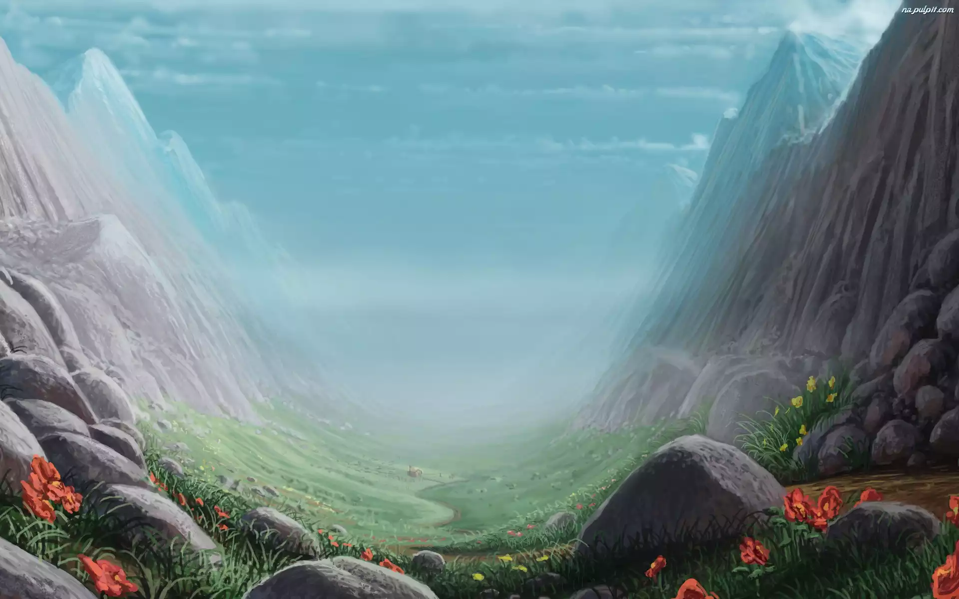 Mgła, Kwiaty, Skały, Góry, Zieleń Na Pulpit
