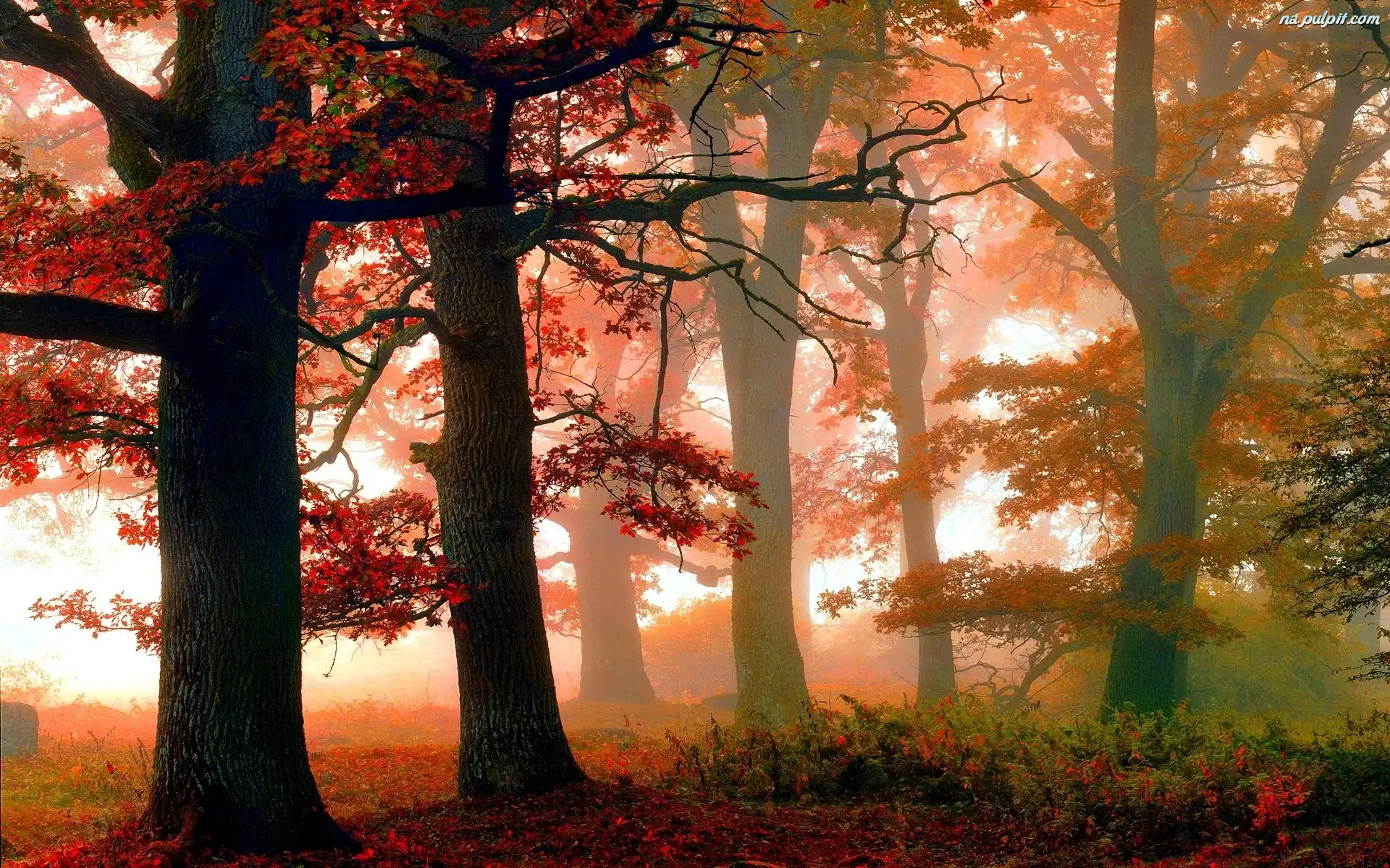 Mgła, Czerwone, Drzewa, Jesień, Liście Na Pulpit