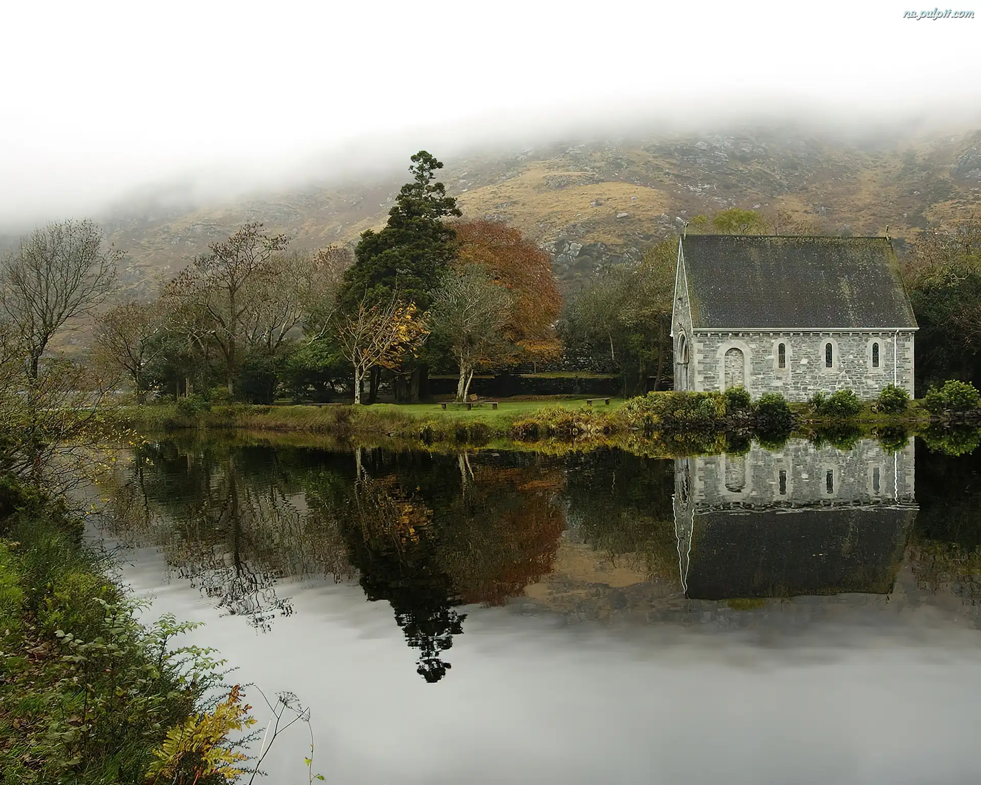 Mgła, Domek, Drzewa, Jezioro, Pagórki Na Pulpit