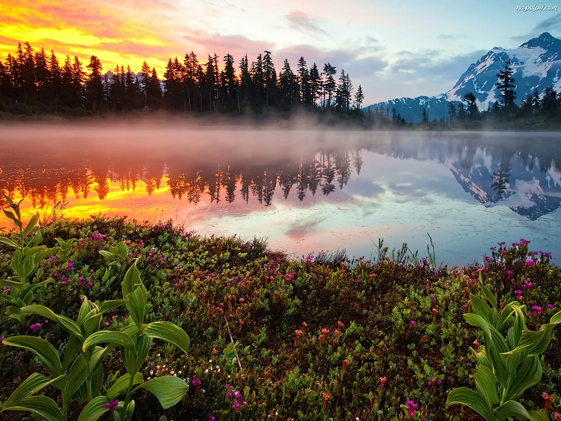 Mgła, Kwiaty, Jezioro, Las Na Pulpit