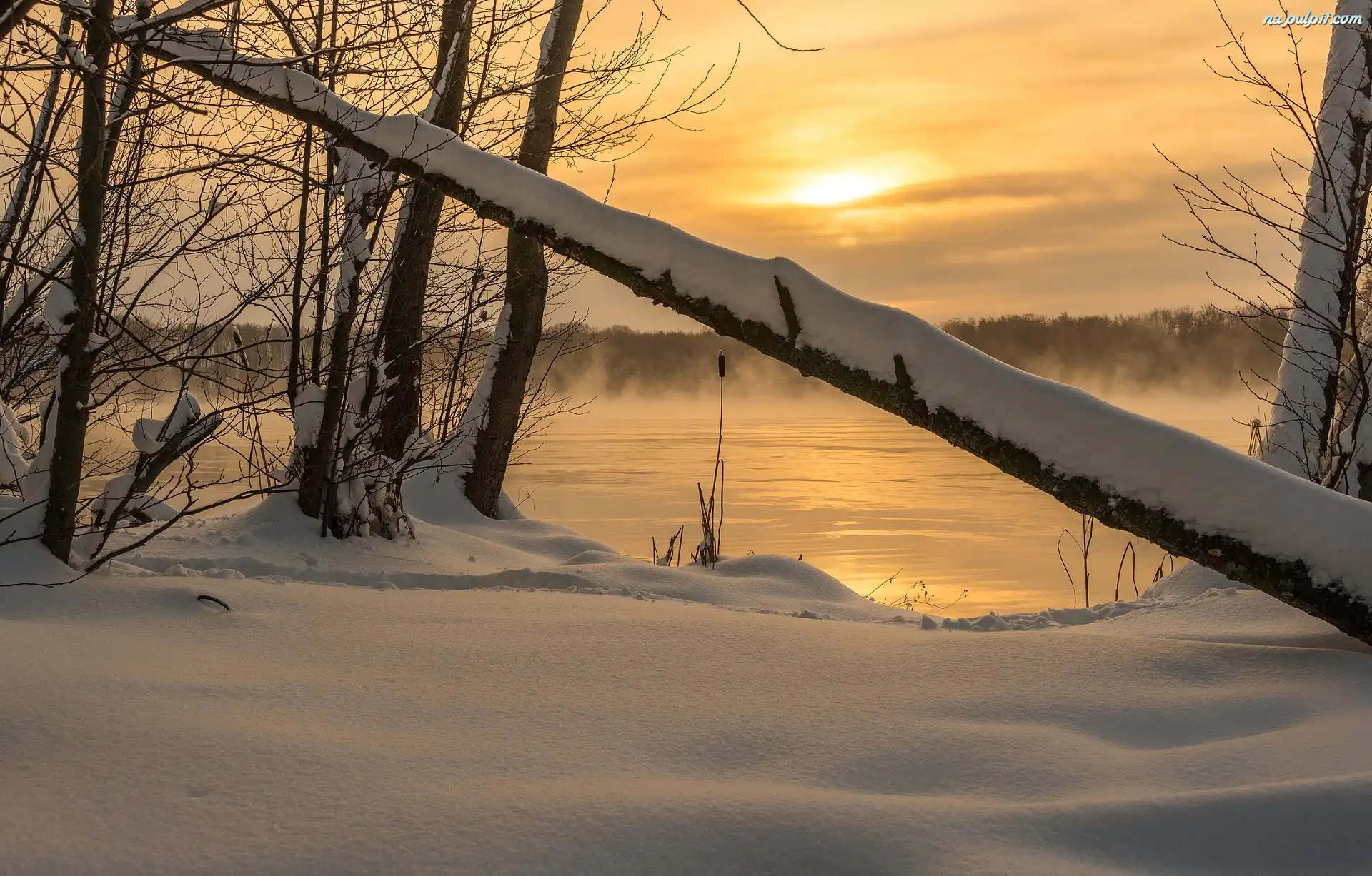 Jezioro, Mgła, Zachód słońca, Drzewa, Zima, Śnieg Na Pulpit