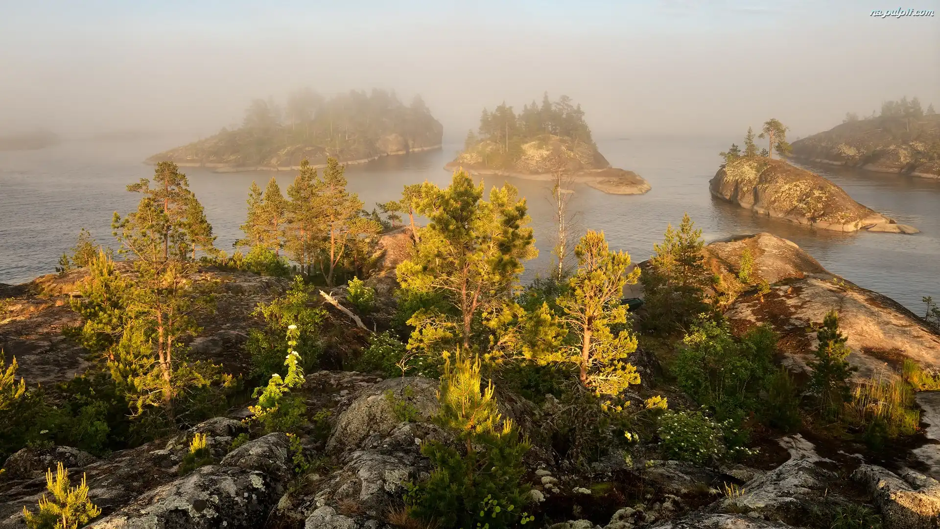Mgła, Skały, Wysepki, Jezioro, Drzewa
