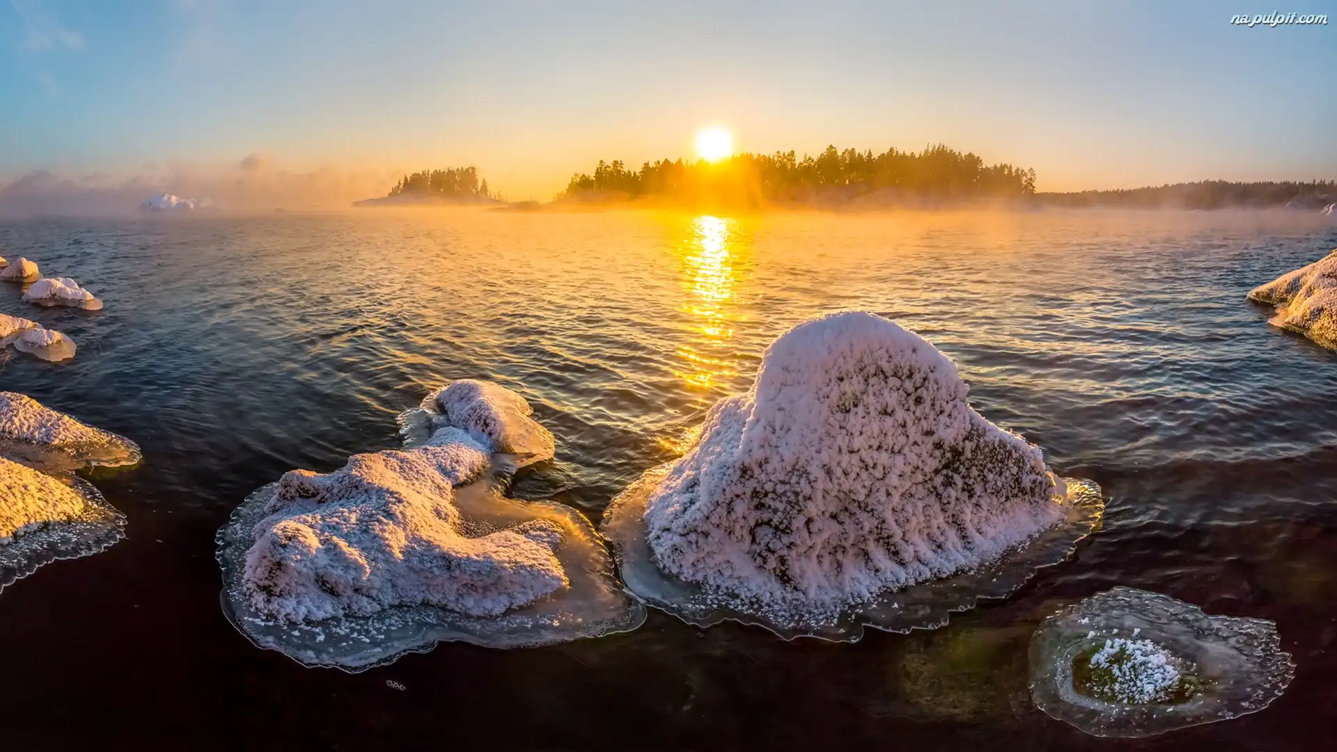 Rosja, Drzewa, Karelia, Wschód słońca, Lód, Jezioro Ładoga, Mgła Na Pulpit