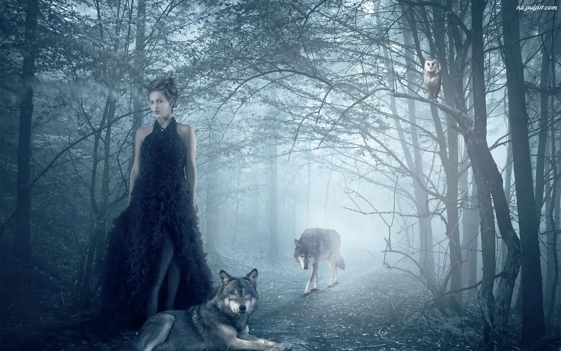 Mgła, Wilki, Las, Kobieta, Sowa Na Pulpit