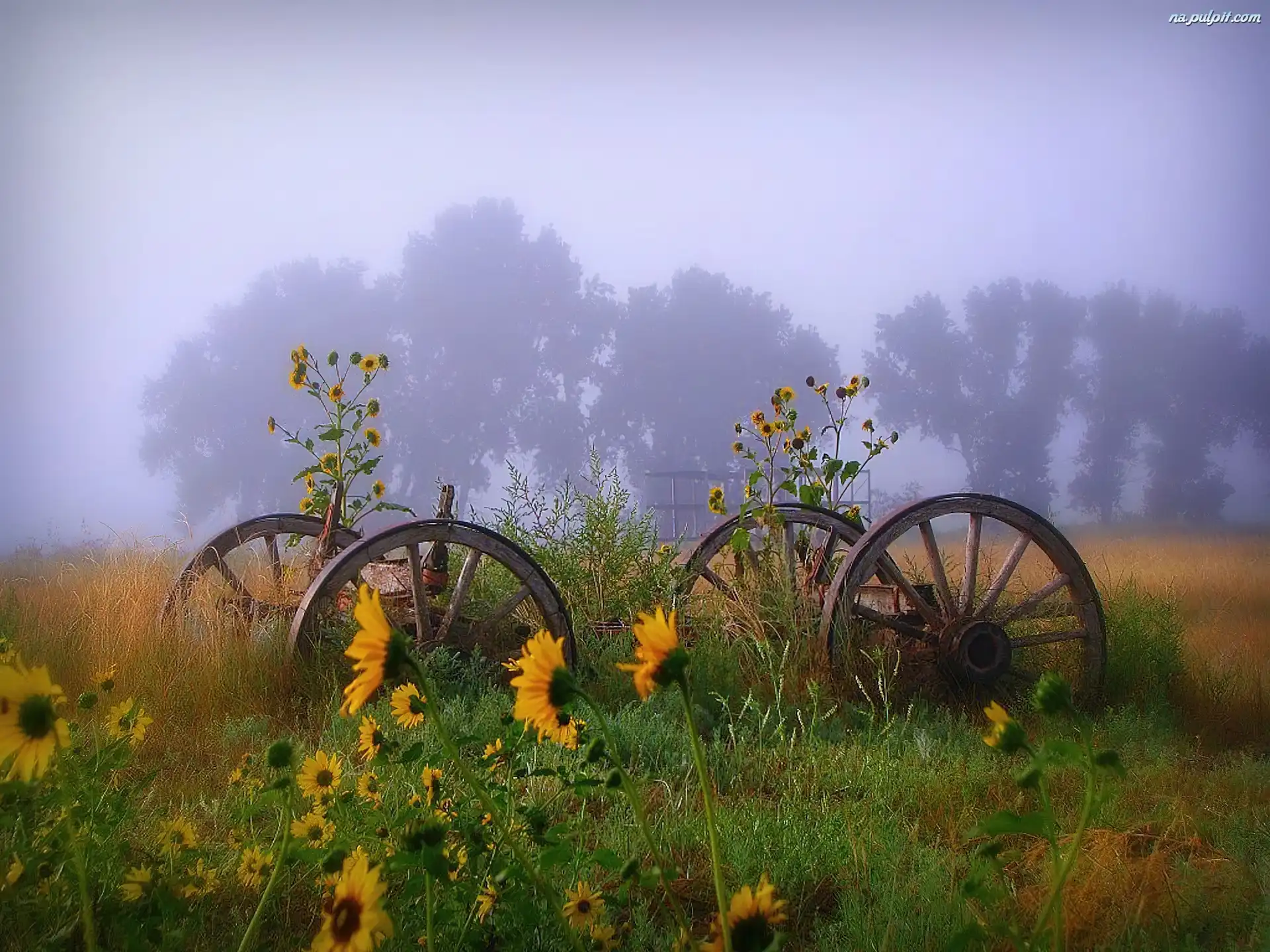 Mgła, Wóz, Koła, Słoneczniki Na Pulpit