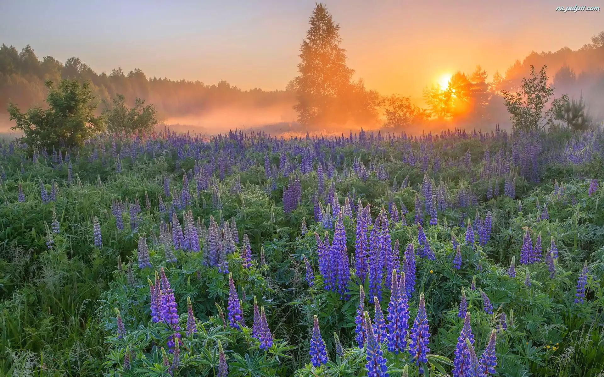 Łubin, Wschód słońca, Mgła, Drzewa, Łąka Na Pulpit