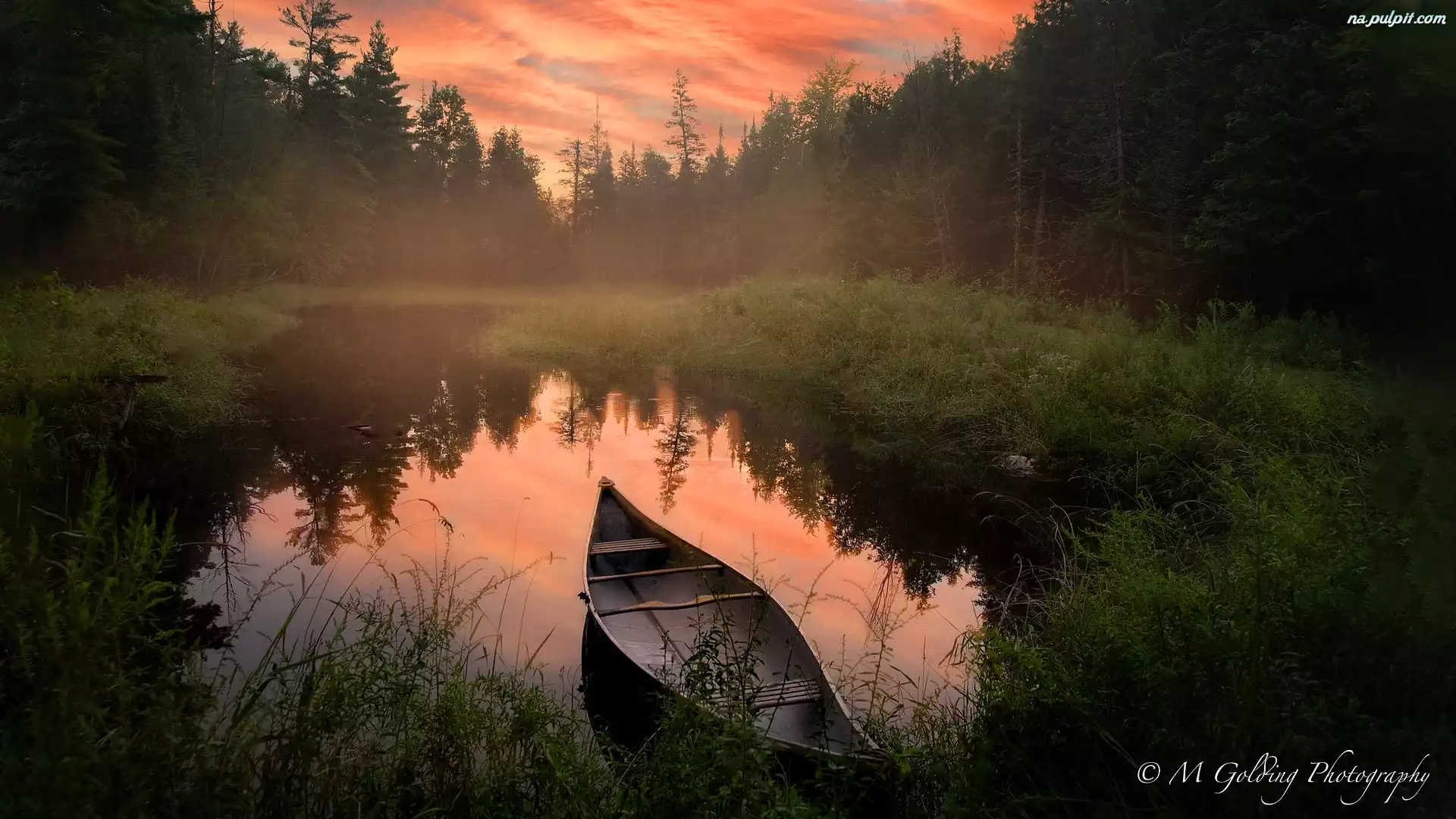 Łódka, Niebo, Las, Staw, Rośliny, Drzewa, Czerwone, Mgła Na Pulpit