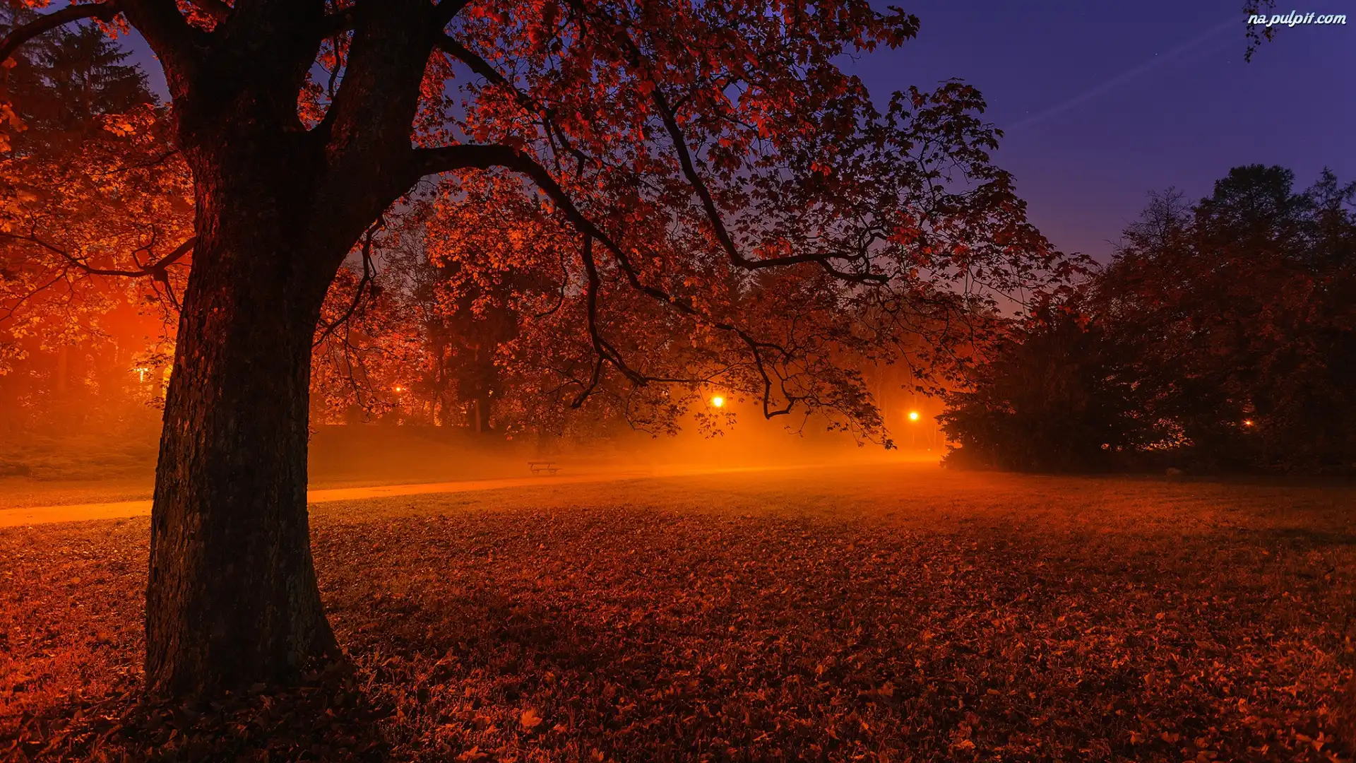 Ławki, Noc, Park, Lampy, Droga, Drzewa, Jesień, Mgła Na Pulpit