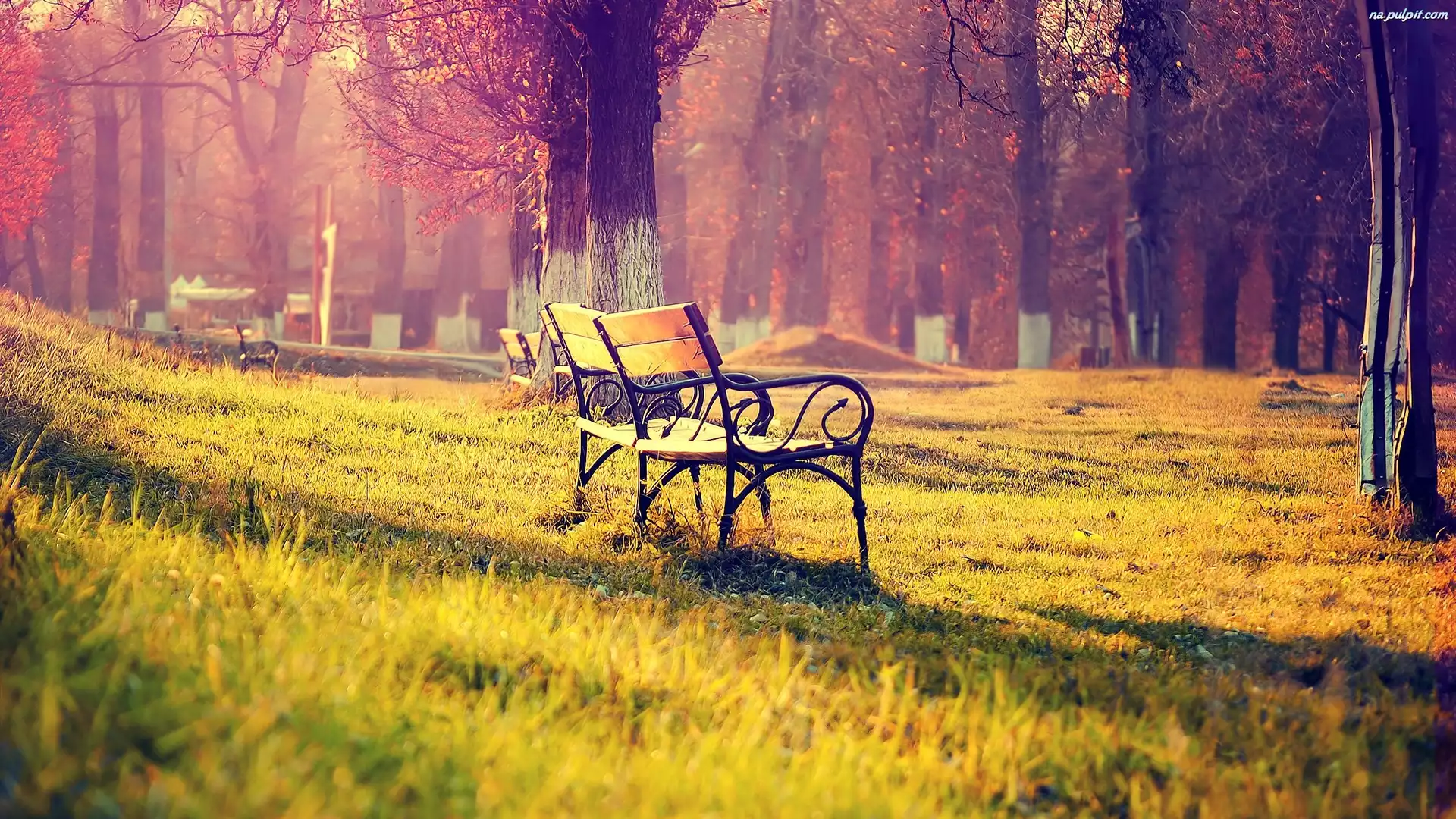 Mgła, Ławki, Jesień, Drzewa, Park, Trawa