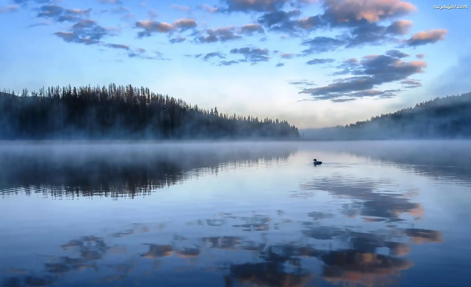 Ptak, Mgła, Świt, Nur lodowiec, Jezioro, Lasy Na Pulpit