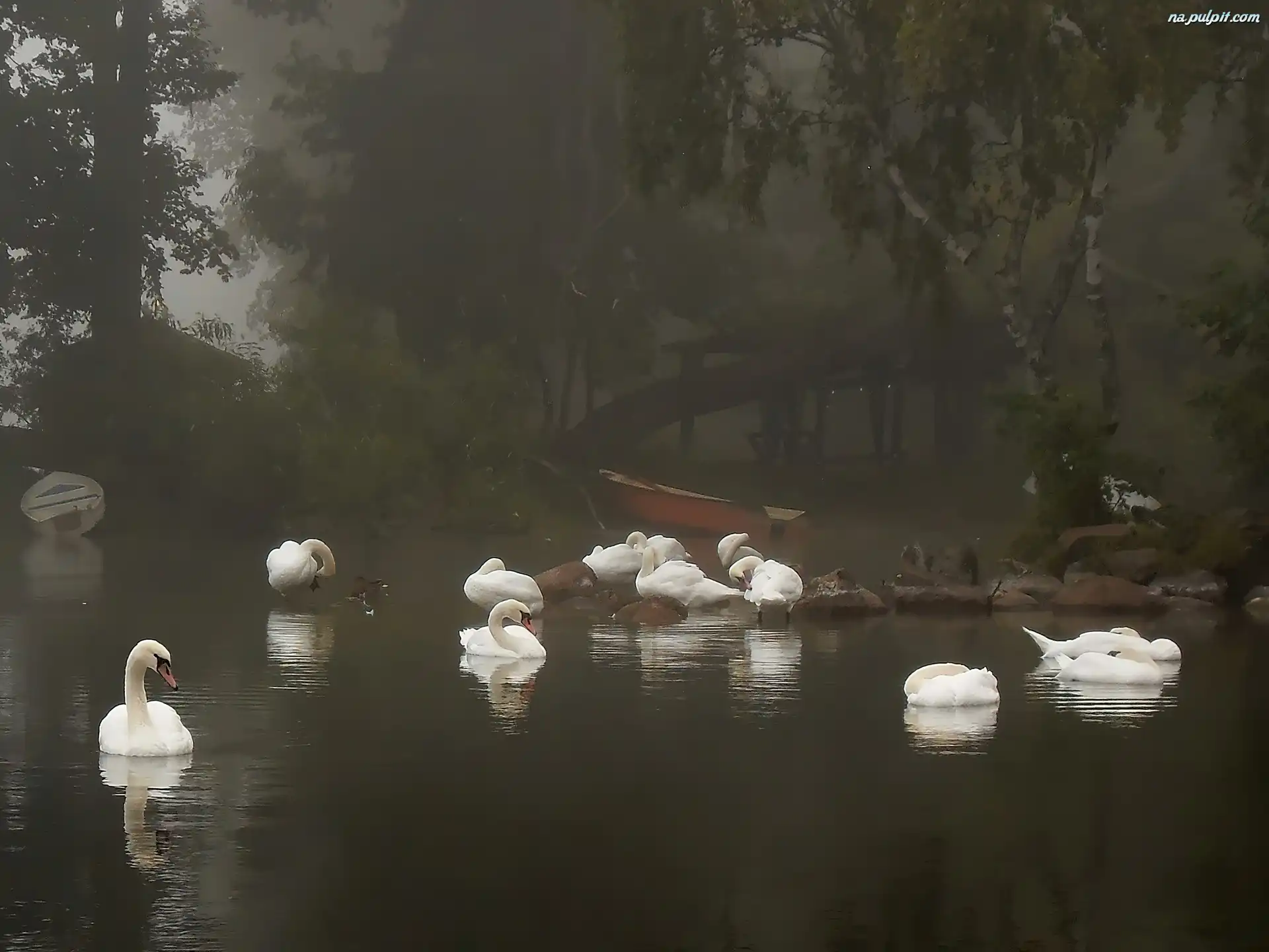 Mgła, Łódki, Łabędzie, Rzeka, Drzewa