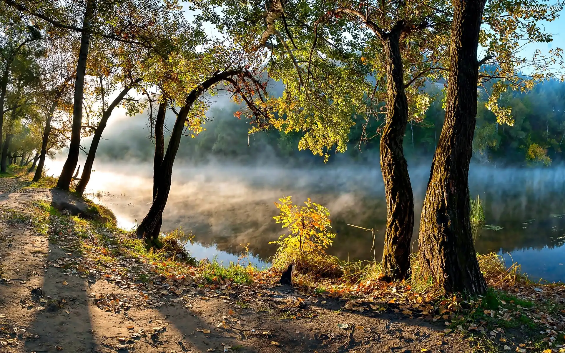 Mgła, Drzewa, Brzeg, Rzeka, Jesień Na Pulpit
