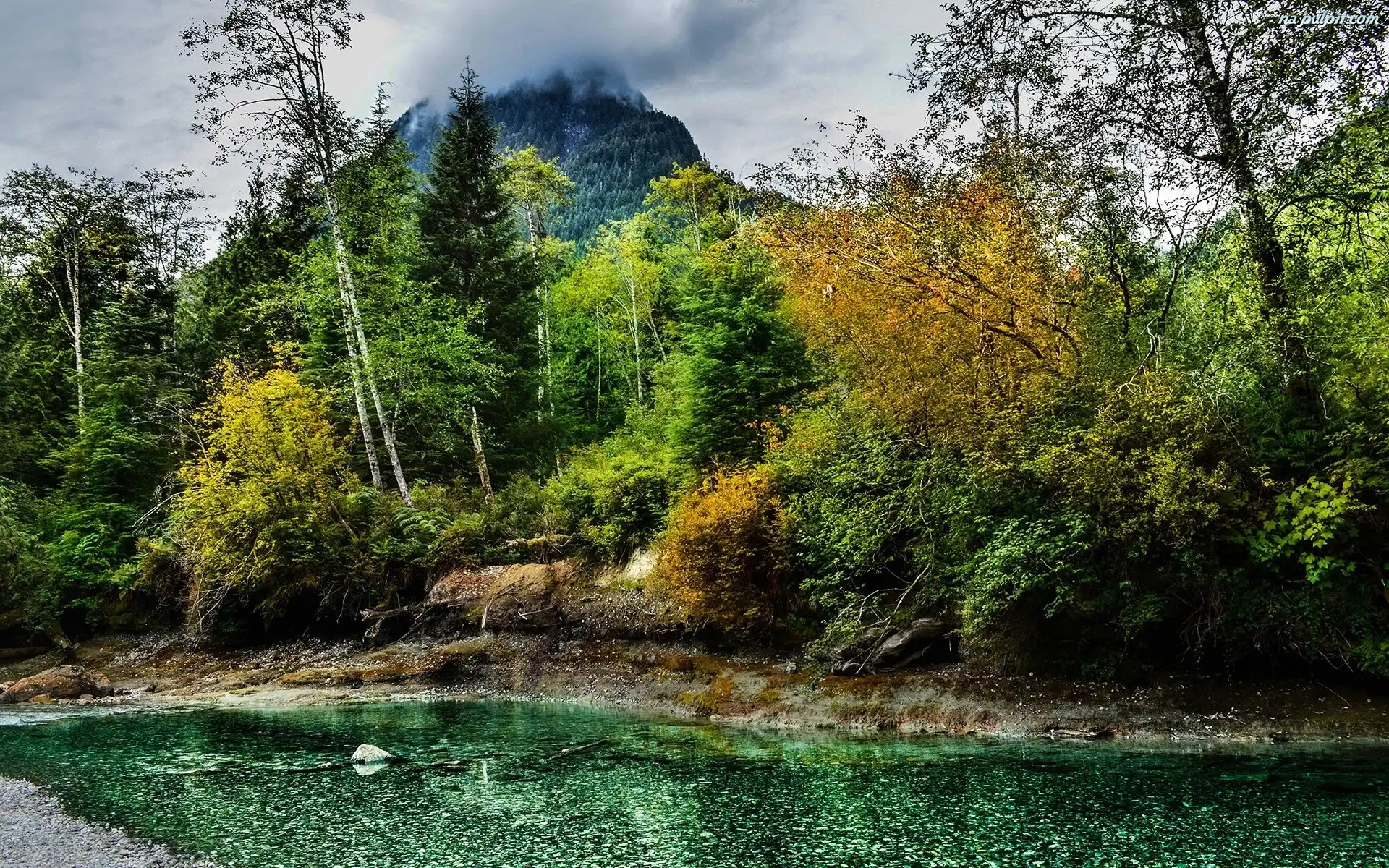 Mgła, Drzewa, Rzeka, Góra