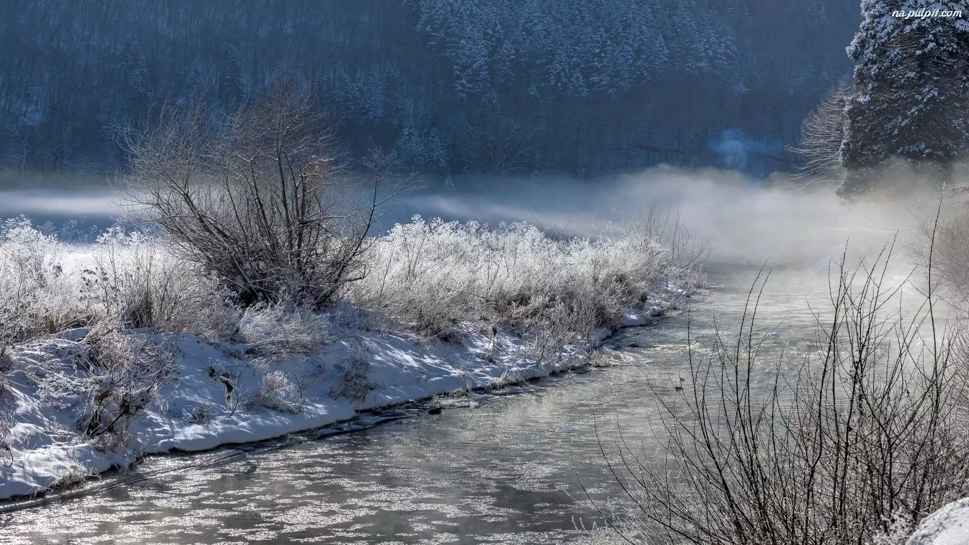 Wschód słońca, Rzeka, Krzewy, Zima, Las, Drzewa, Mgła Na Pulpit